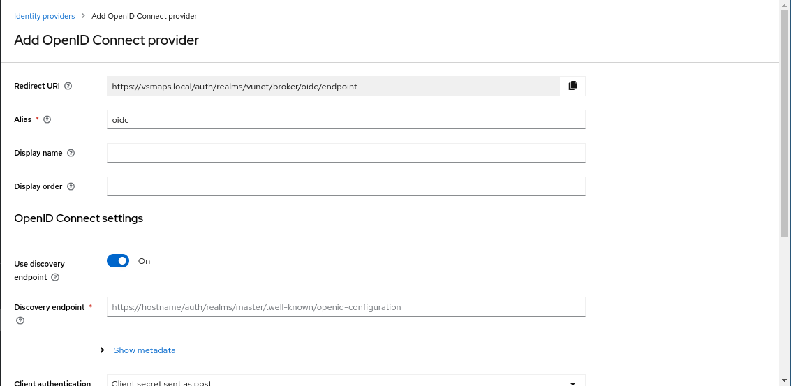 - Client Authentication: Specify how the IDP will interact with the identity provider. Use the default value ("Client secret sent as post") unless instructed otherwise.