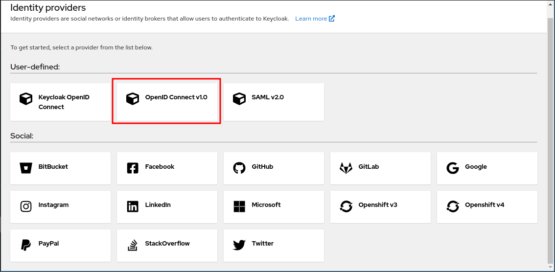 Accessing the Configuration Page: Open the identity provider’s administration console and navigate to the "Identity Providers" section. Click on OpenID Connect v1.0 in the User-defined section to initiate the configuration process.