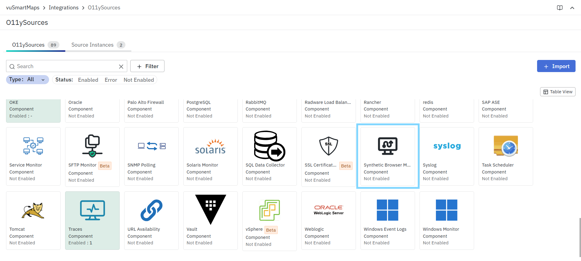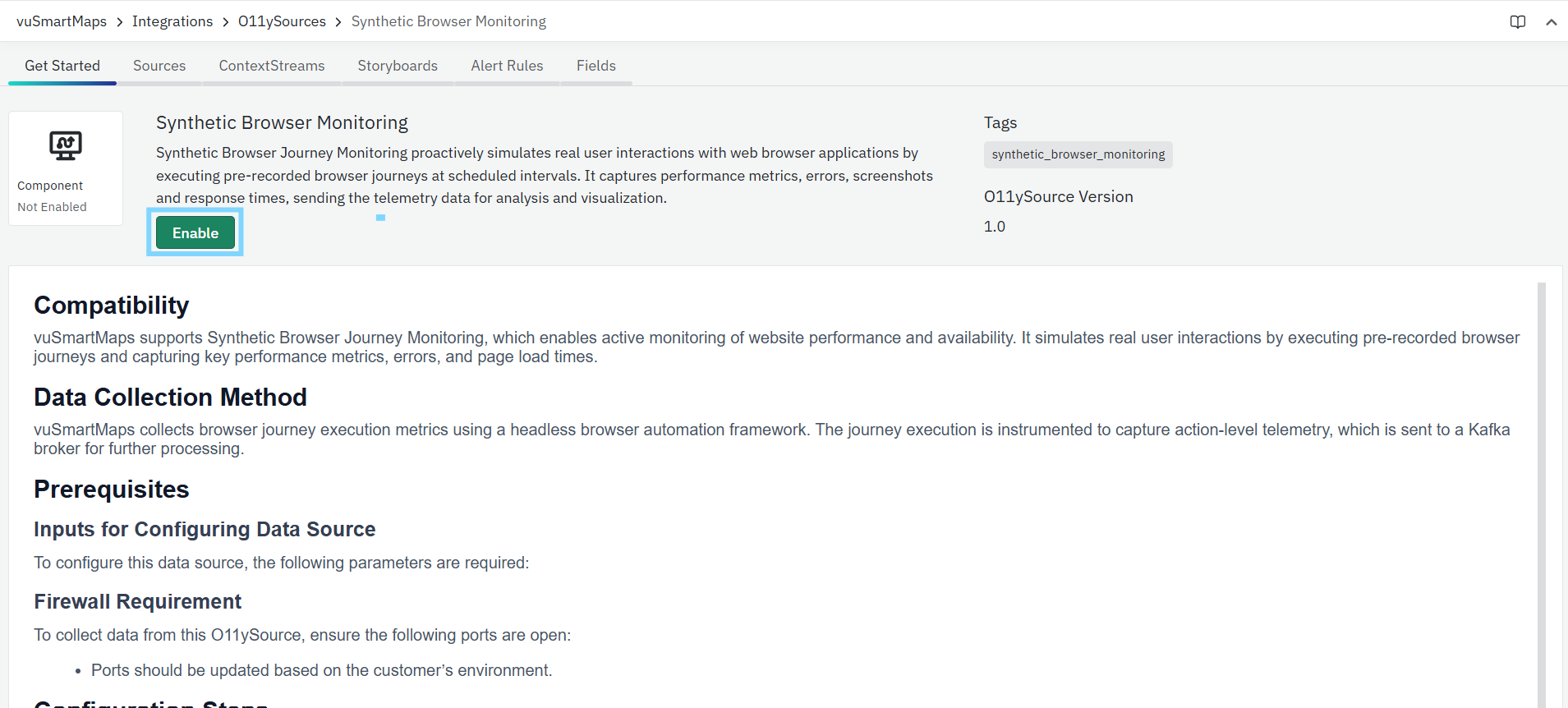 - Click the Enable button to activate vuSyntheticBrJourney O11ySource.
