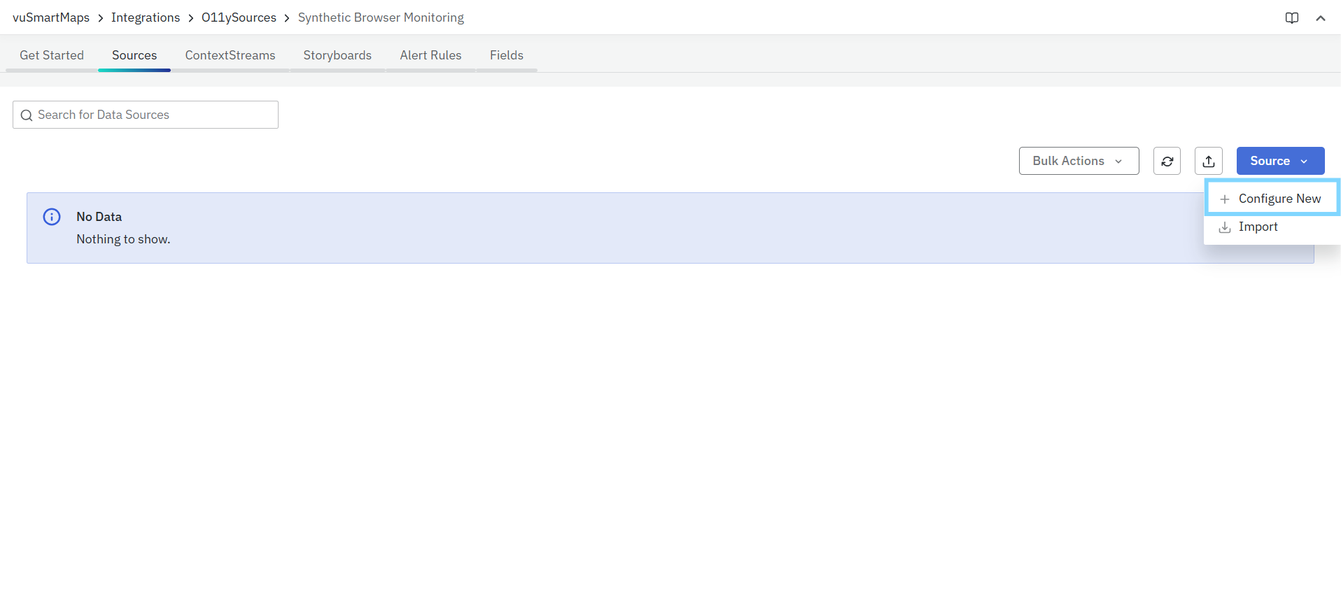 - To add and configure a Synthetic Browser Journey data source: Go to the Sources tab inside the Synthetic Browser Journey O11ySource. Click Source (top-right) → Configure New.