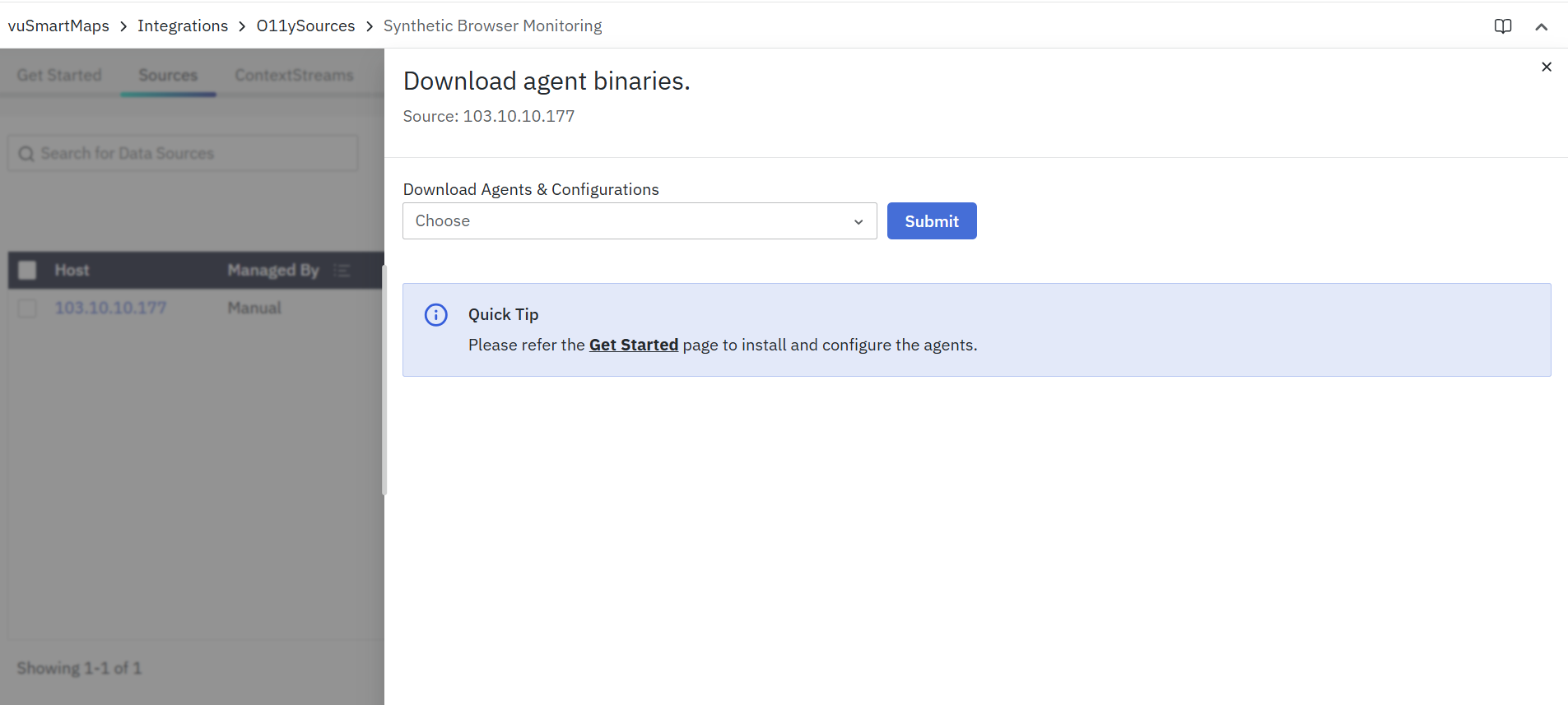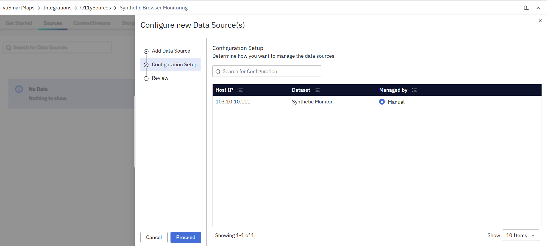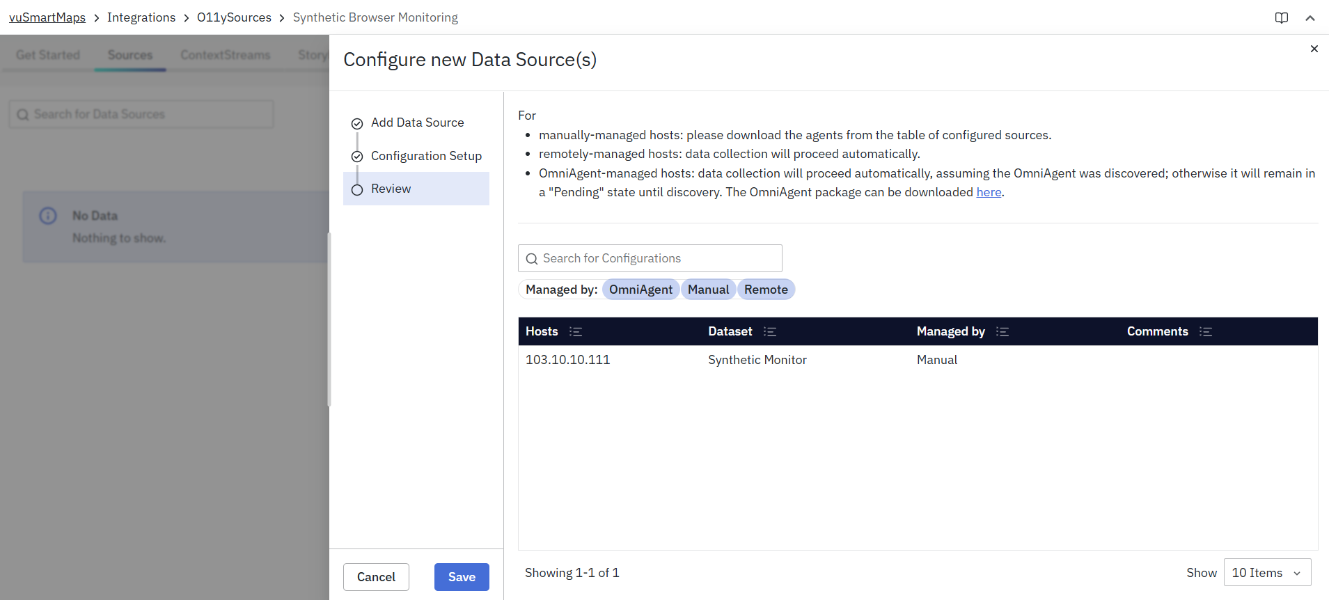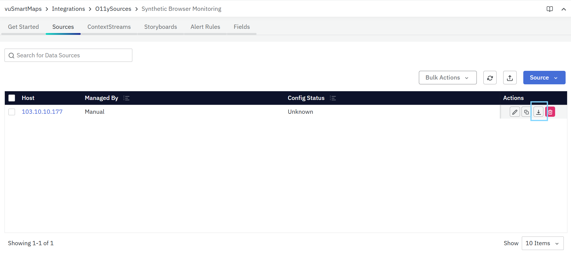 - vuSmartMaps O11ySources can be accessed by navigating from the left navigation menu (Integrations > O11ySources).
