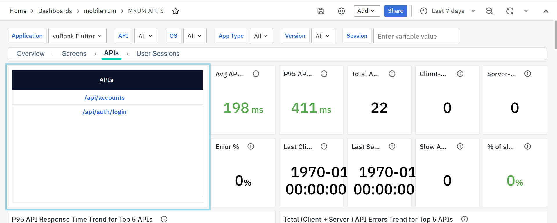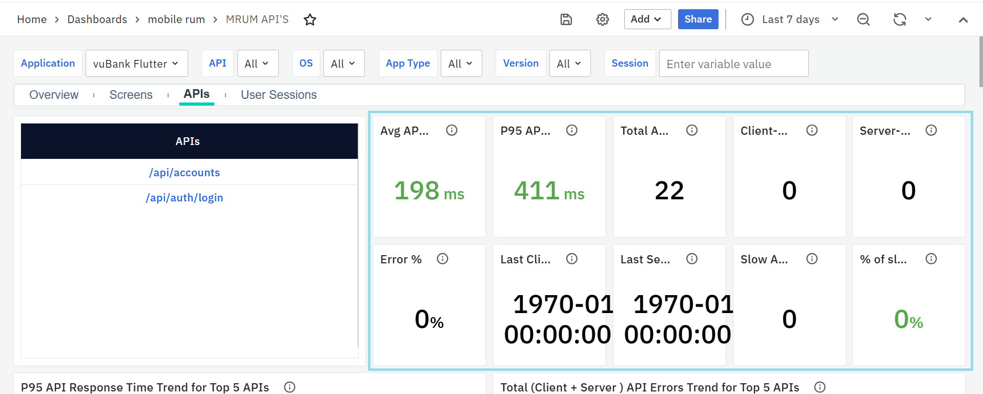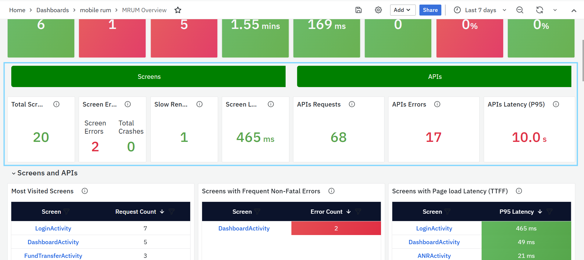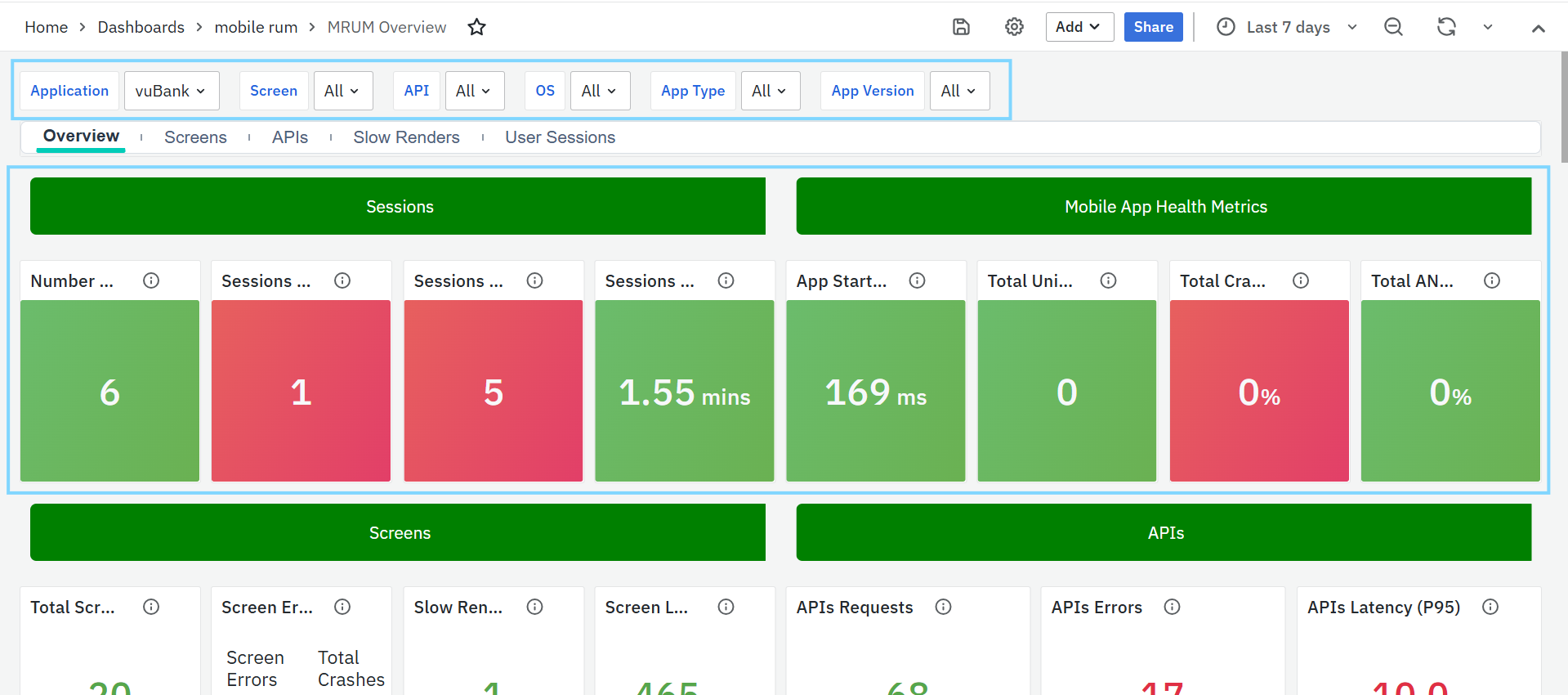 The MRUM Overview dashboard gives a quick summary of how your mobile app is performing. It includes several panels that show important metrics related to screens, APIs, performance, and sessions. Each panel also contains a small trend graph to help you spot changes over time.