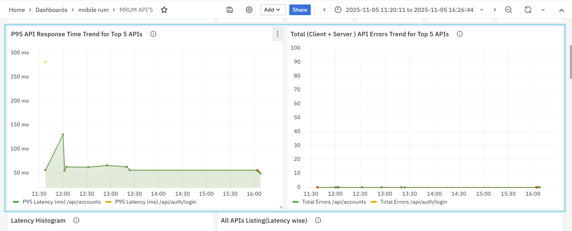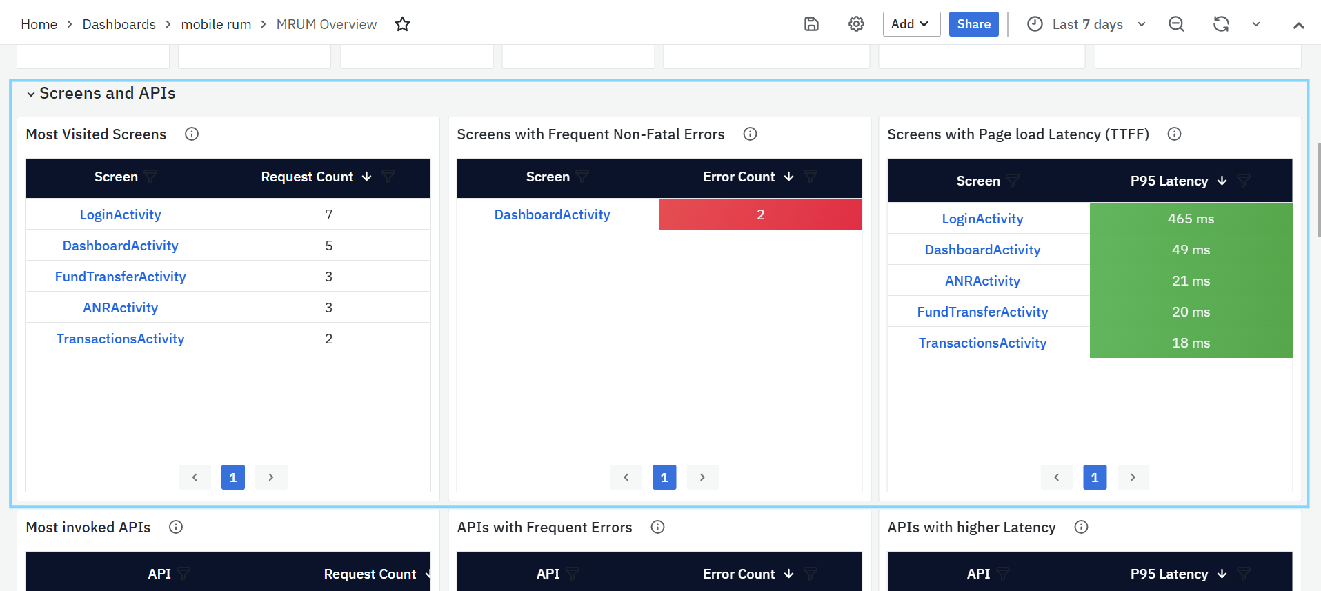 This panel helps you track the most used and most problematic screens and APIs in your mobile app. It identifies areas that are popular, slow, or prone to frequent issues, allowing teams to take action where it matters most.