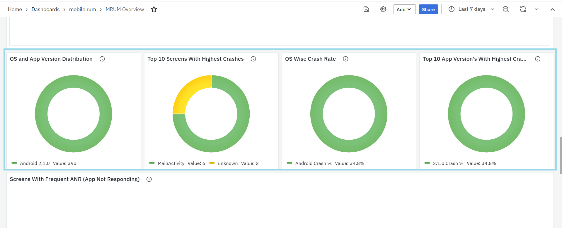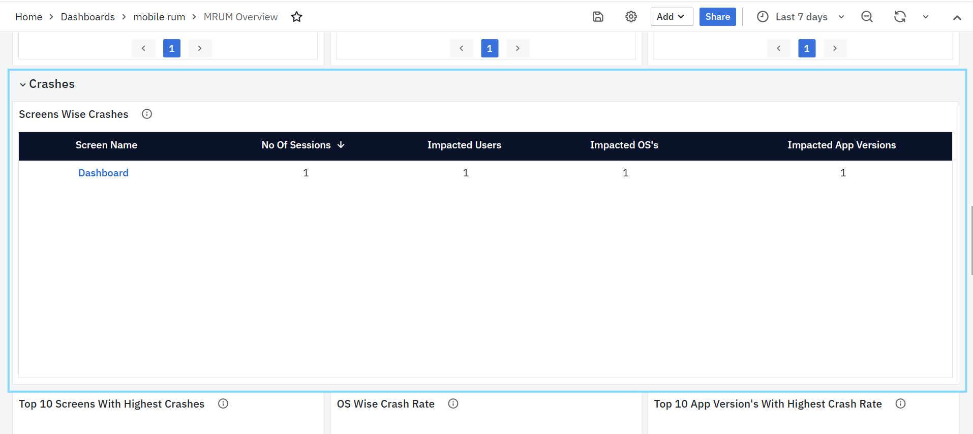 Total Unique Crashes & Total Crash Rate is a clickable metric that redirects to the MRUM Screens for detailed information.