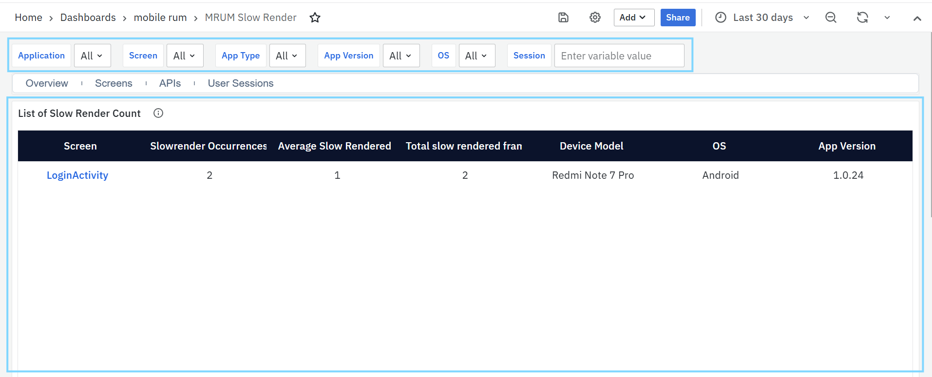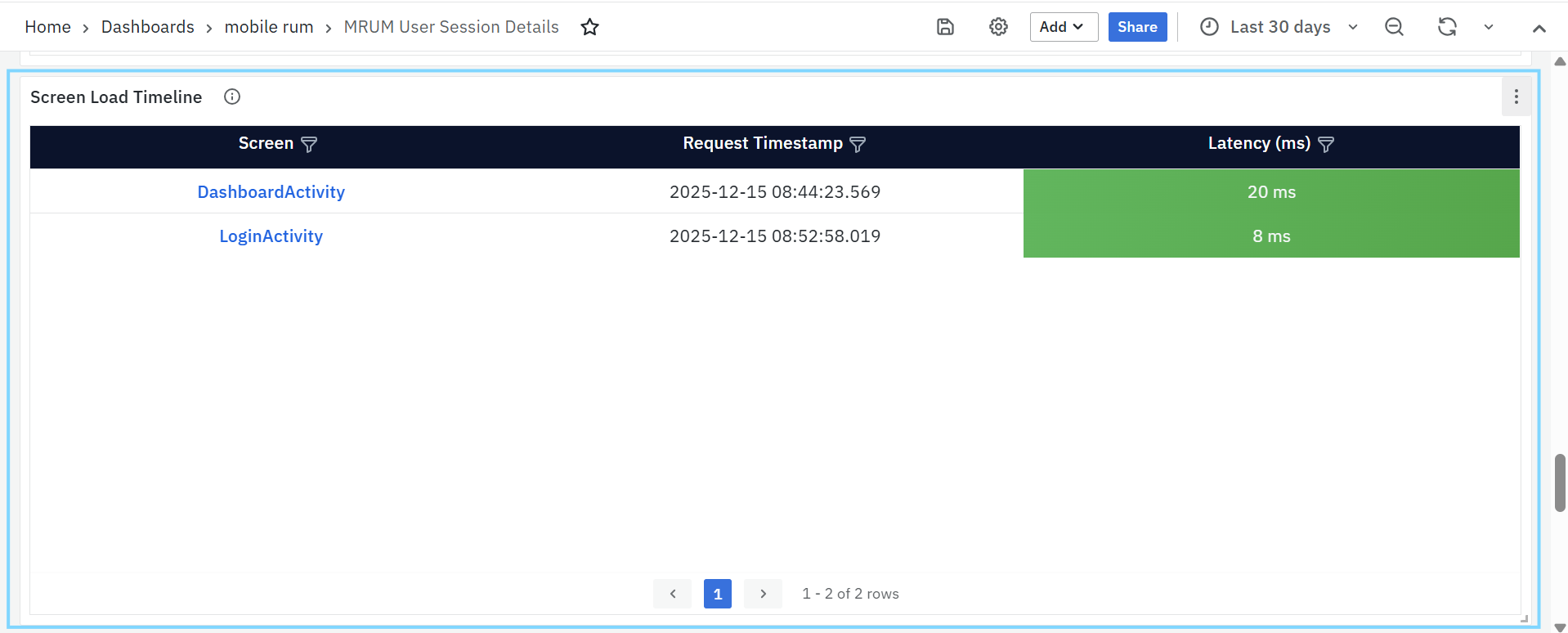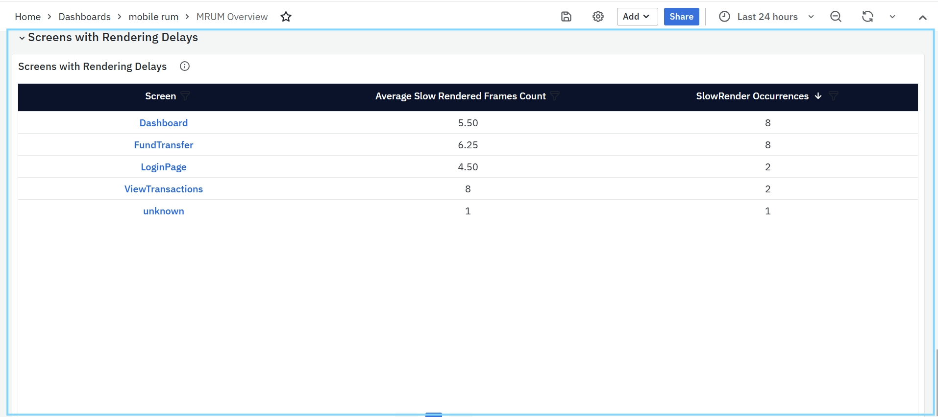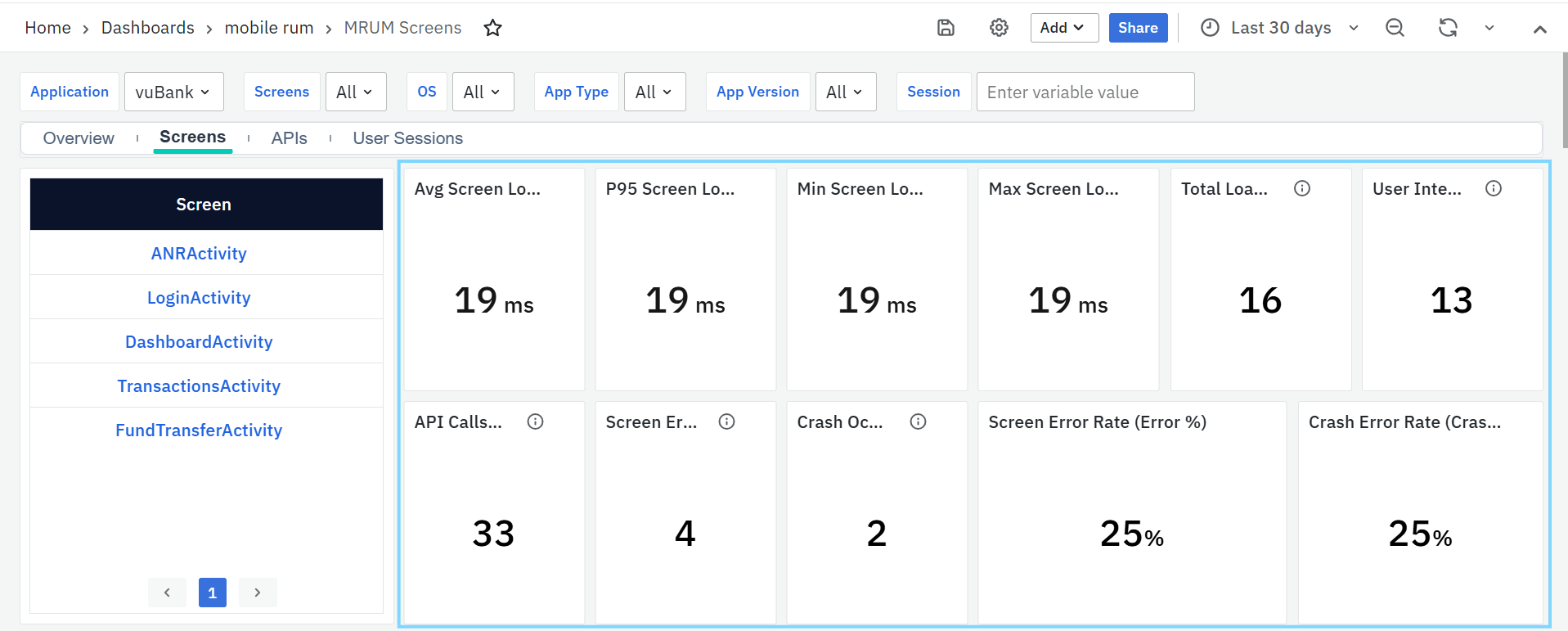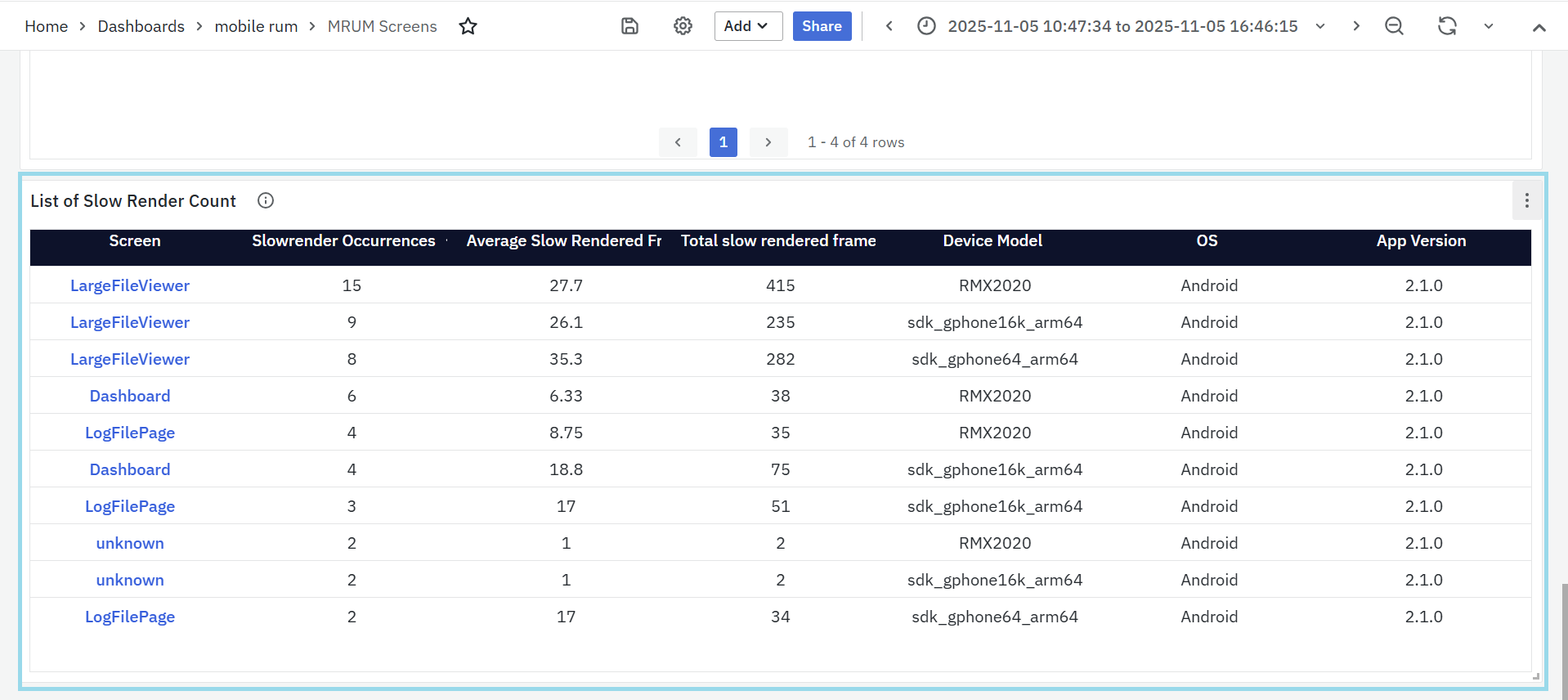 - Screen – Name of the screen loaded; clickable to navigate to the Mobile RUM Screens Dashboard for detailed analysis.