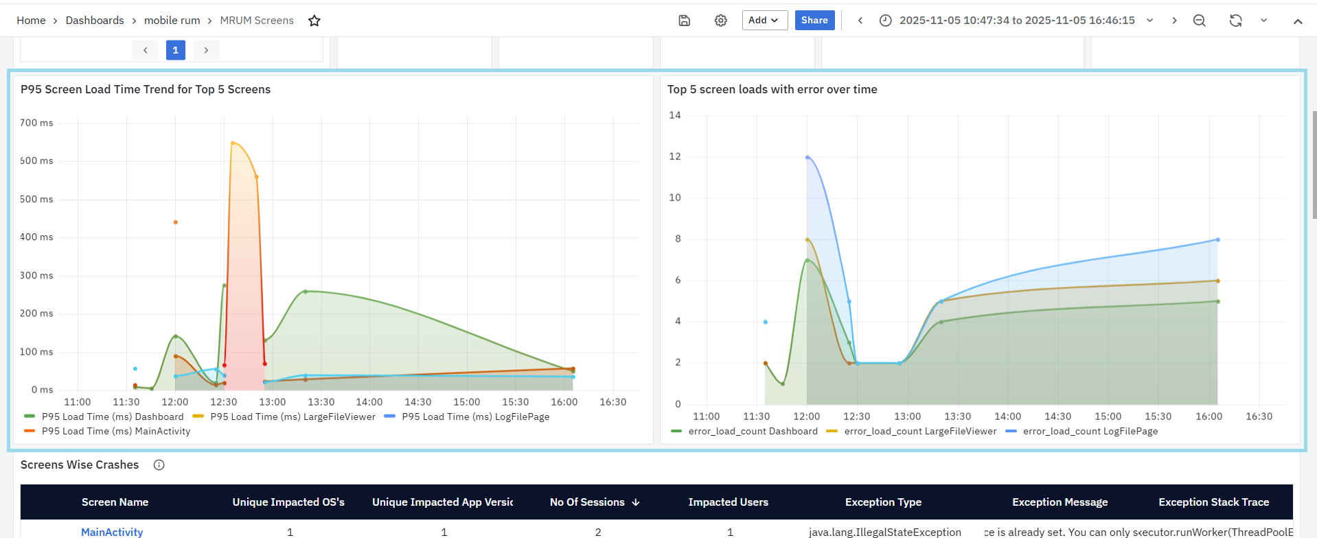 - Screen Load Timeline: Displays individual screen load events captured during the selected time range.