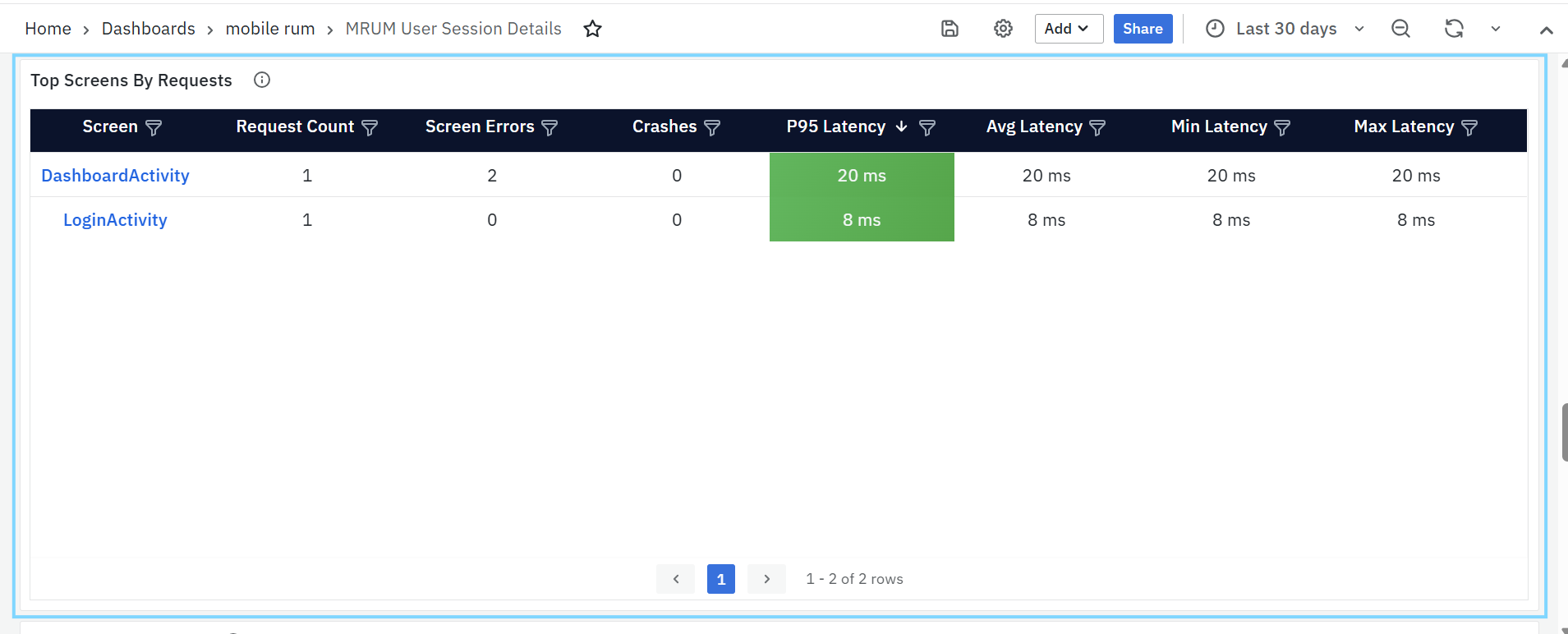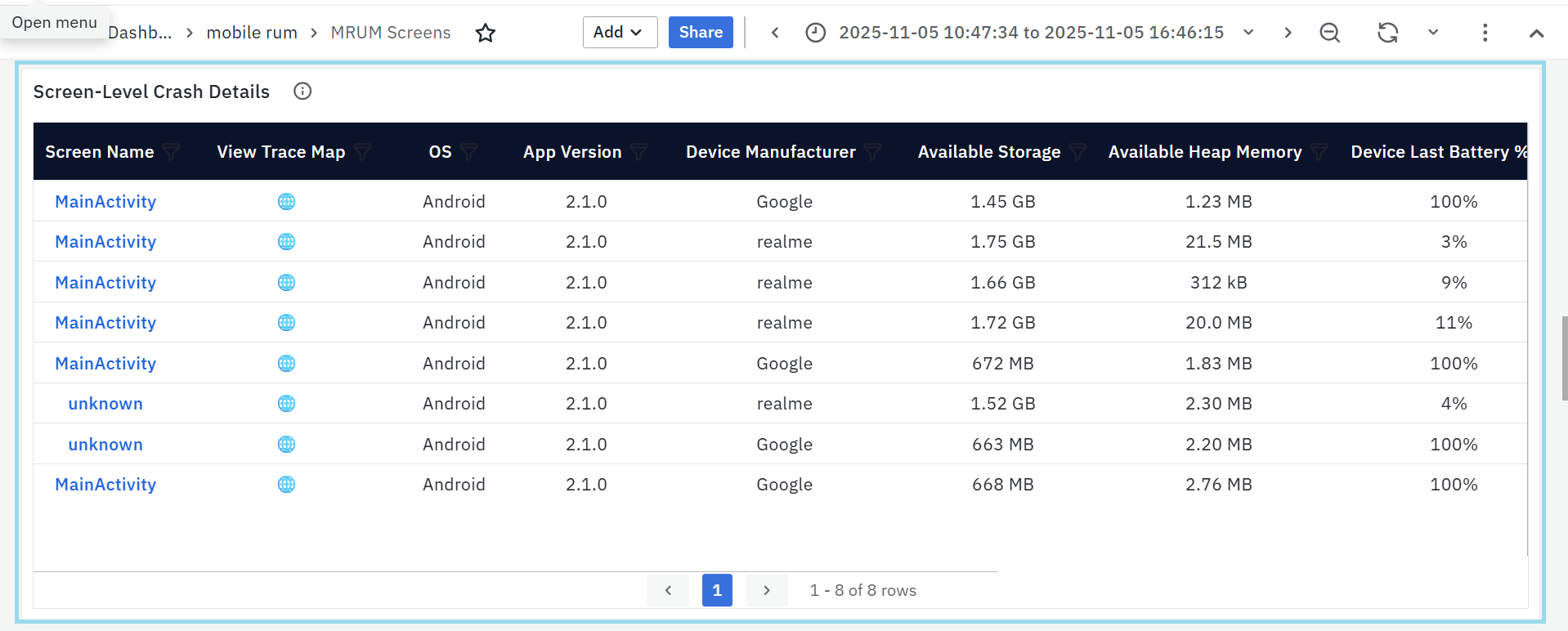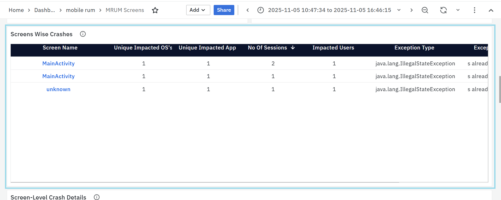 - The Screen column has clickable links that open the MRUM Screens Dashboard for more details.