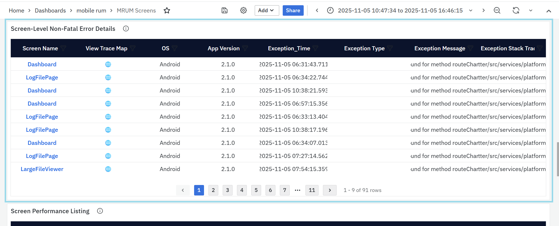 - Screen-Level Non-Fatal Errors with Stack Traces: Lists runtime exceptions that didn’t crash the app