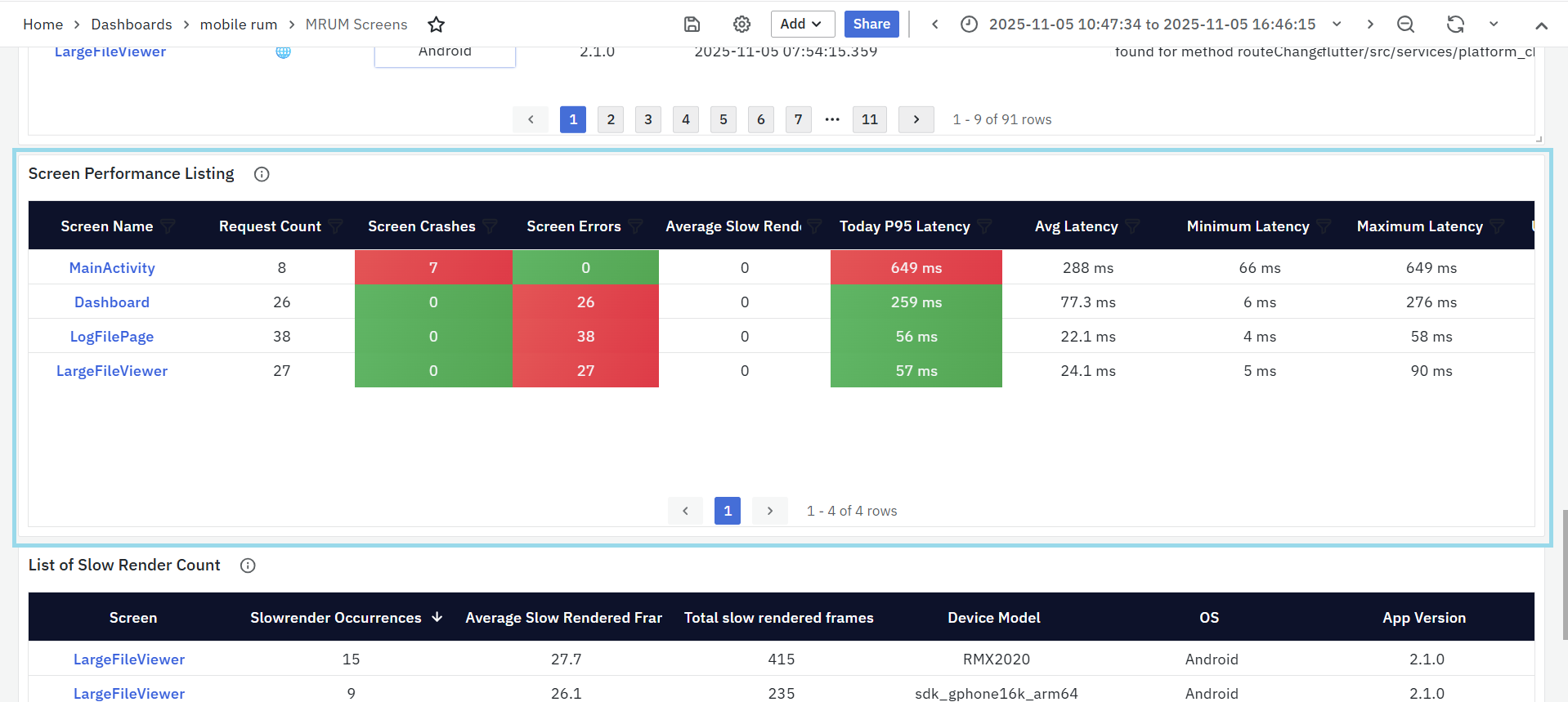 - P95 Latency – 95th percentile screen load time, highlighting slow-performing screens.