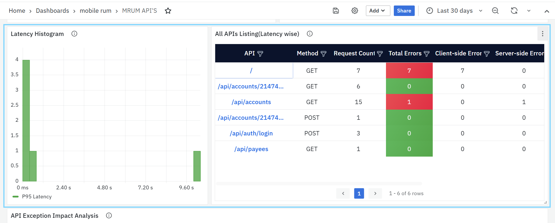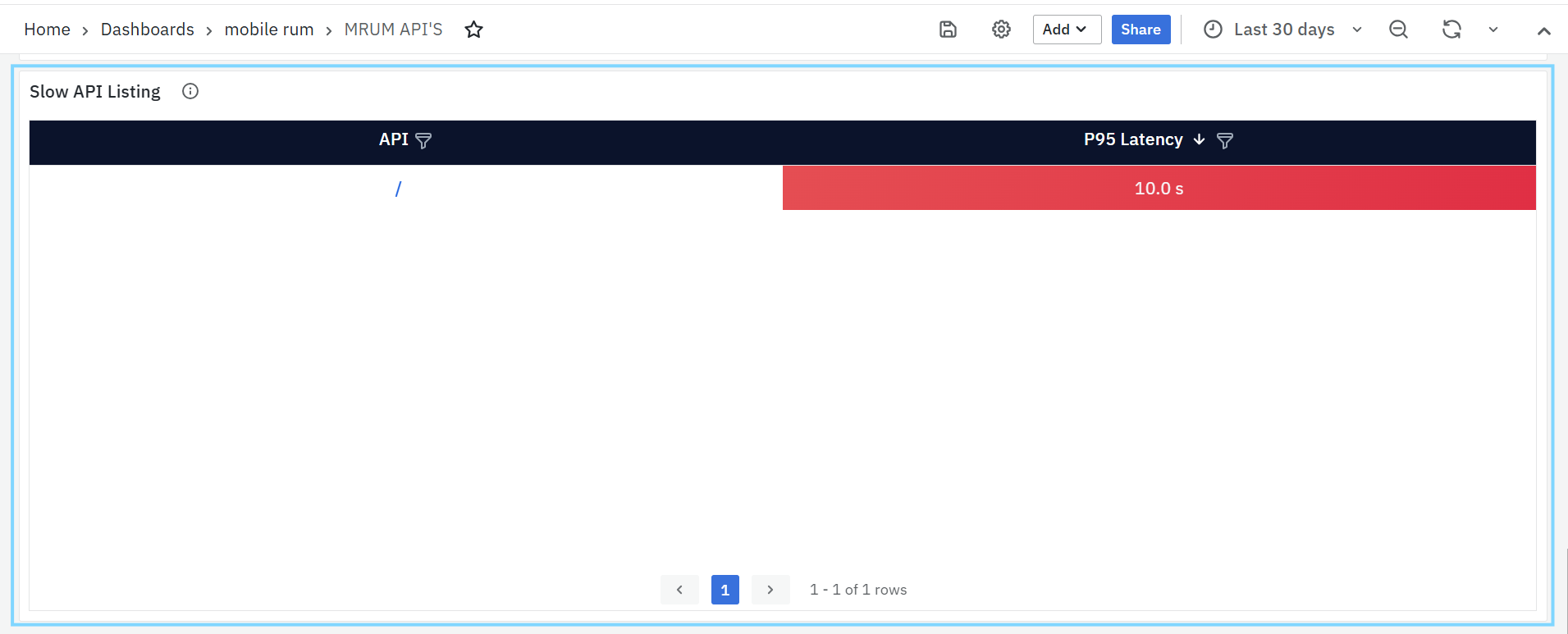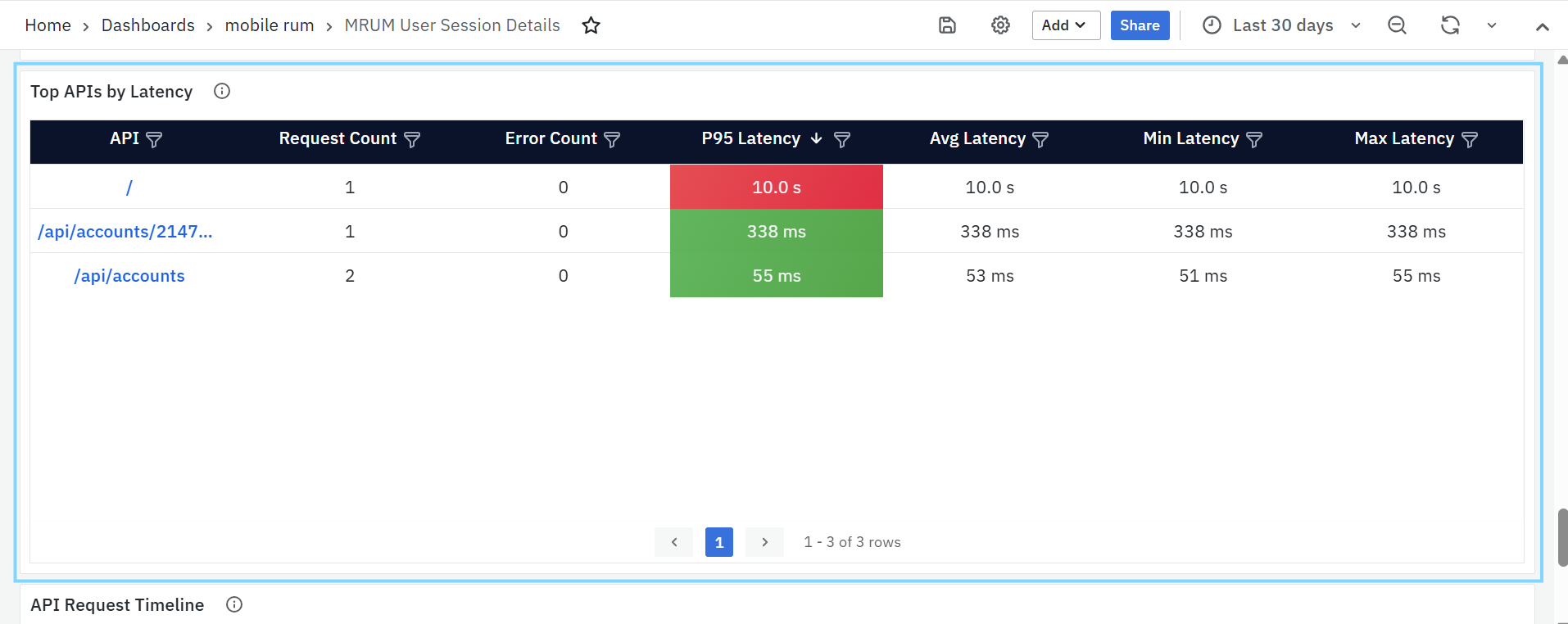 - The API column links to the MRUM APIs Dashboard for troubleshooting.