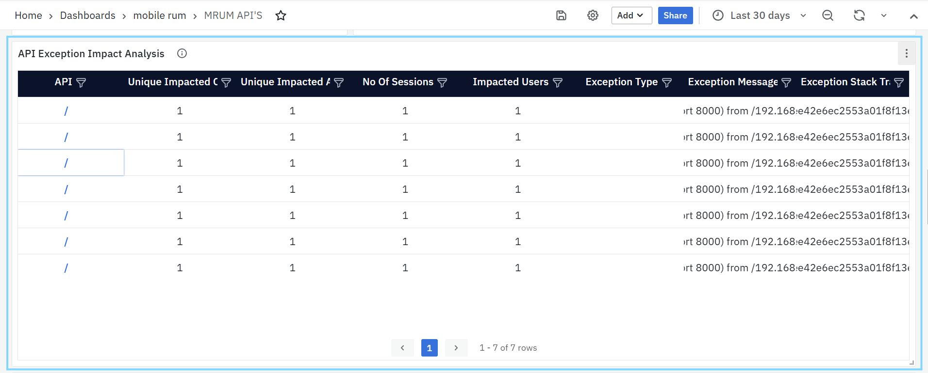 - The API column has clickable links to the MRUM APIs Dashboard.