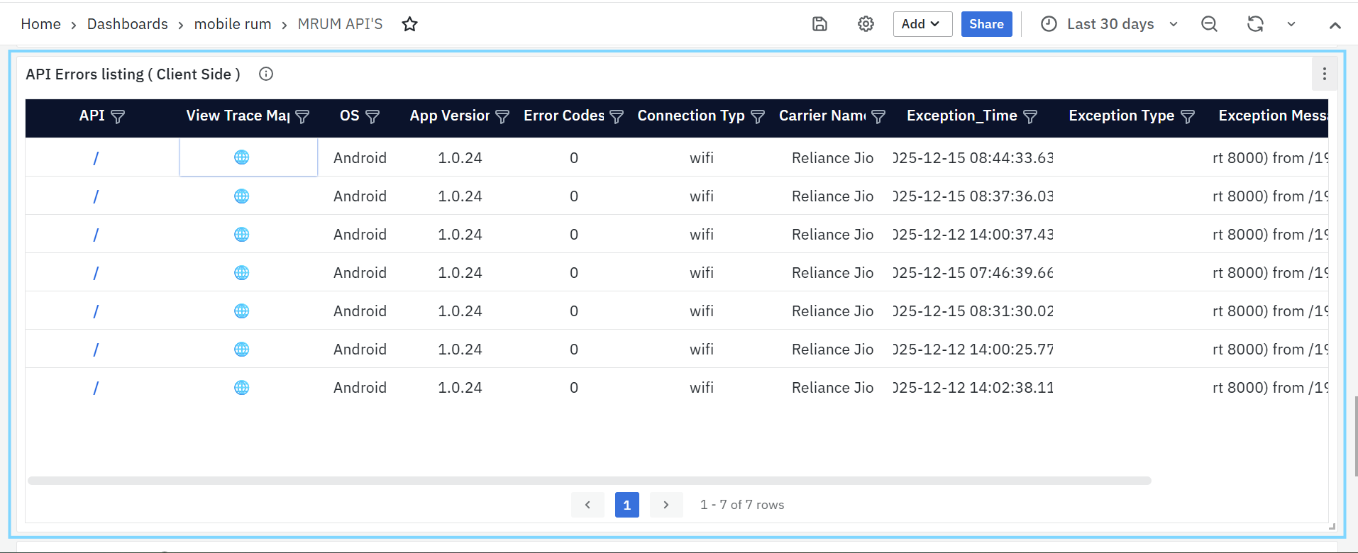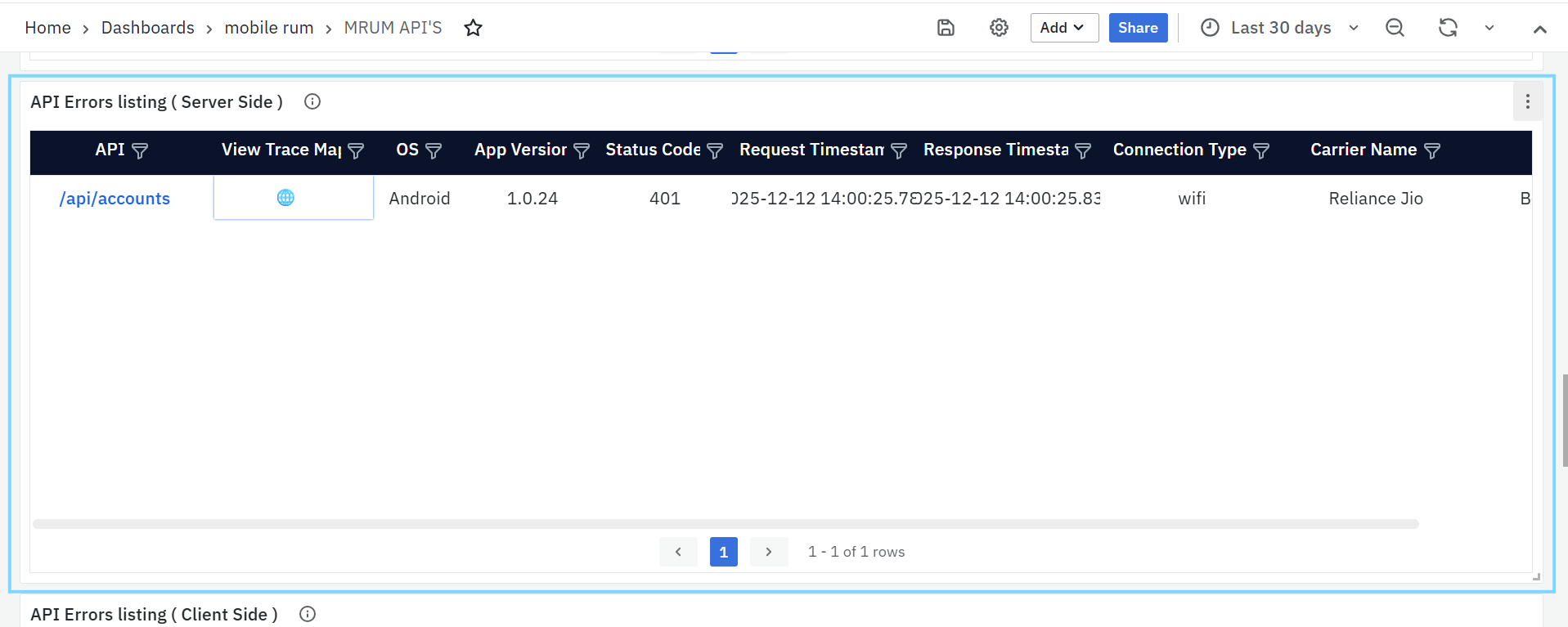 The MRUM Trace Listing Dashboard provides a detailed list of individual traces collected from the selected mobile application. It helps you analyze request-level performance and identify latency or failure points within user sessions.