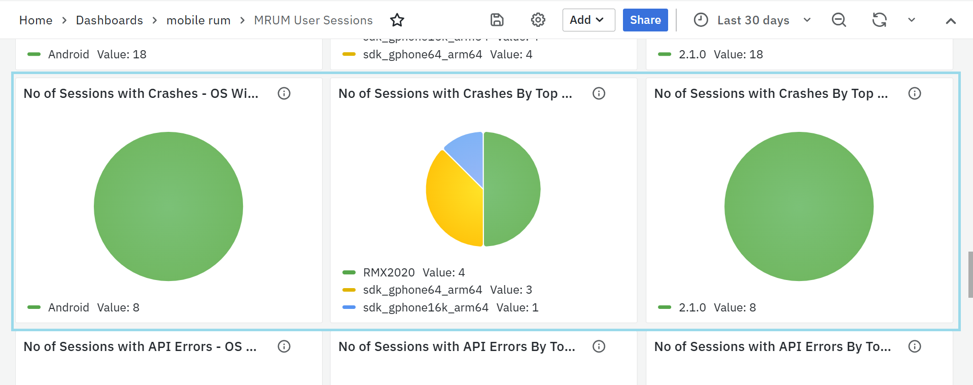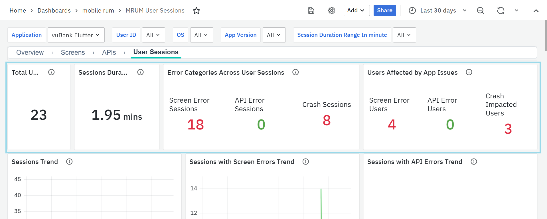 Sessions with Screen Errors & Sessions with API Errors is a clickable metric that redirects to the MRUM User Sessions Dashboard for detailed information.