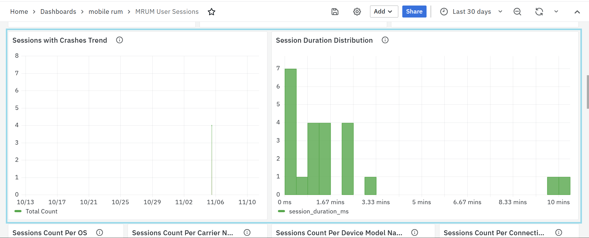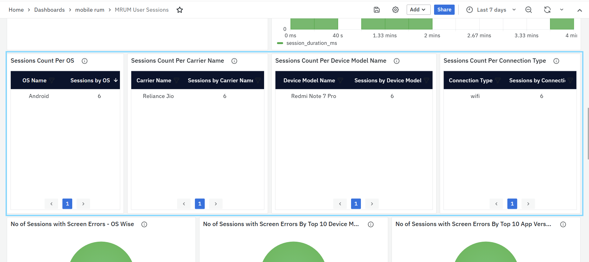 The Sessions panel provides key insights into how users interact with your mobile app. It helps track usage trends, detect screen/API issues, and understand session duration patterns. The following metrics are included: