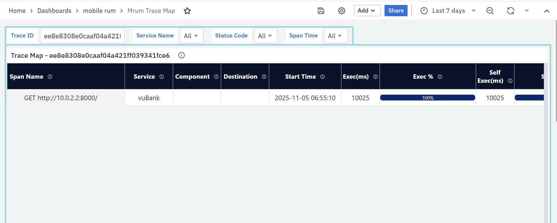 - Trace ID: Clickable link that opens the MRUM Trace Map for deeper trace visualization.