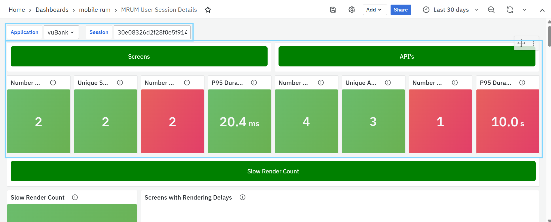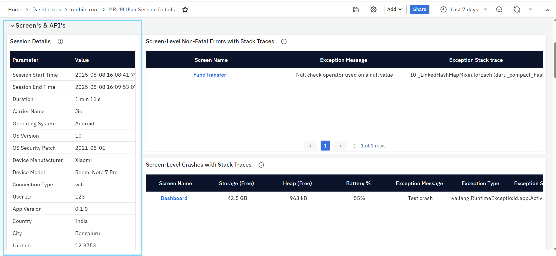 The User Session Details Dashboard provides a detailed view of an individual user session, helping analyze performance, stability, and user interactions. It is divided into multiple panels that focus on screens, APIs, rendering performance, errors, and user journey.