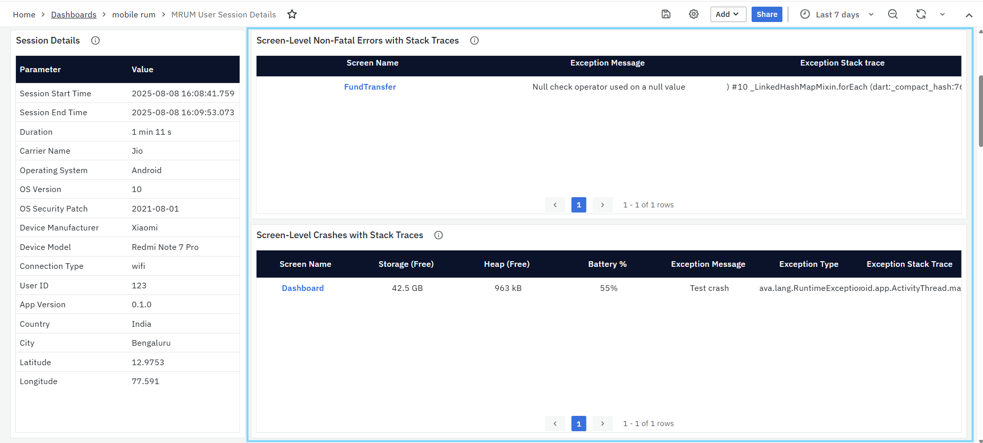 - Screen-Level Crashes with Stack Traces: Shows fatal errors that caused the app to crash