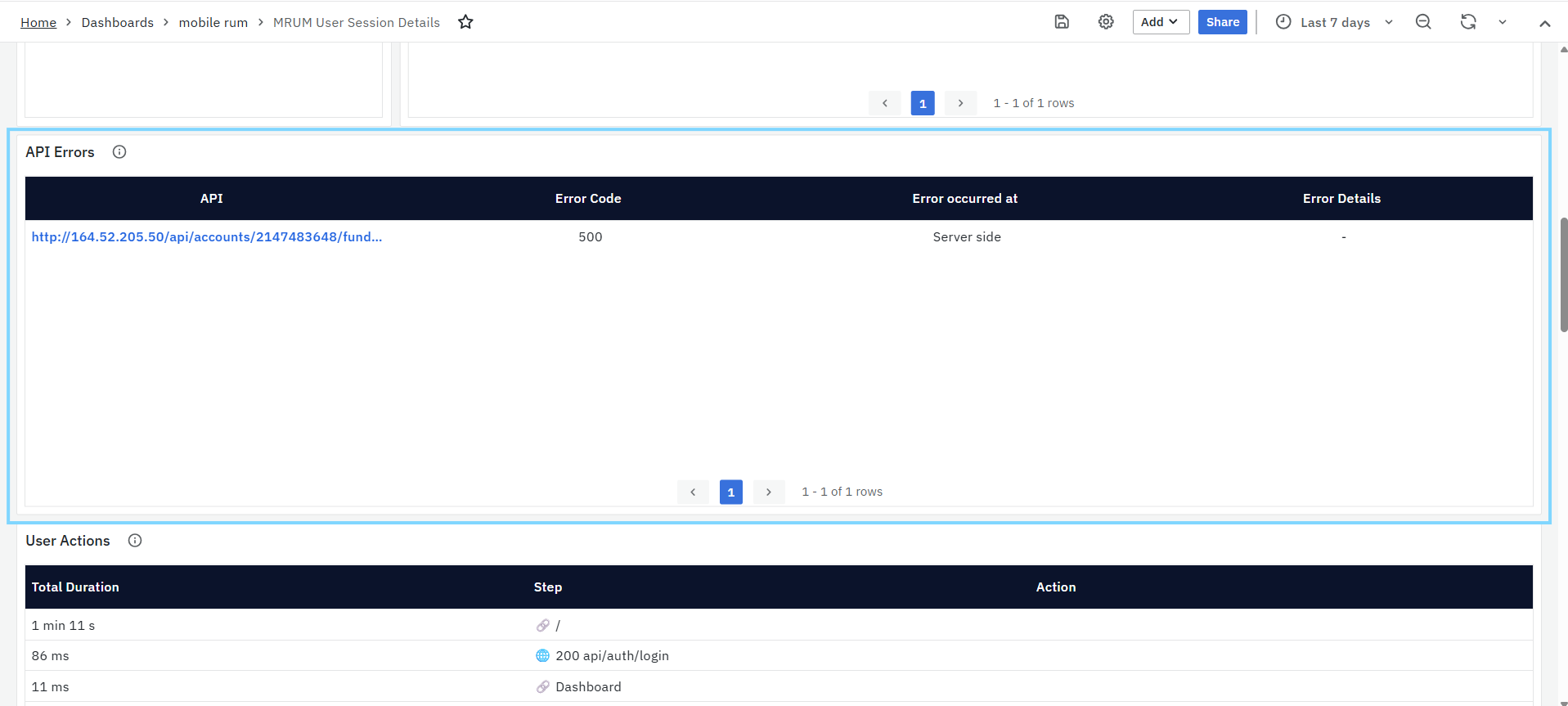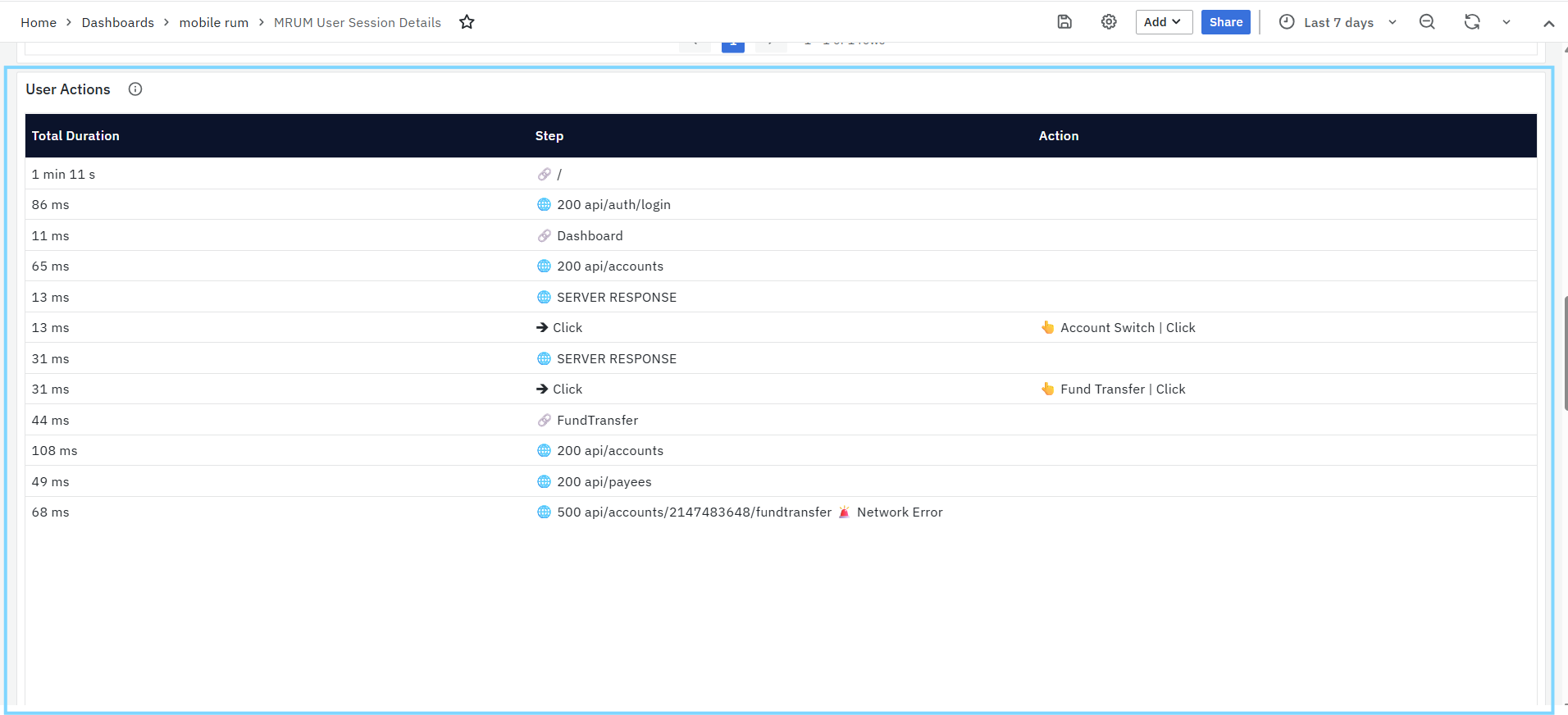 - User Actions: Shows the sequence of screen navigations, API calls, and clicks during the session, along with load/response times to identify performance bottlenecks.