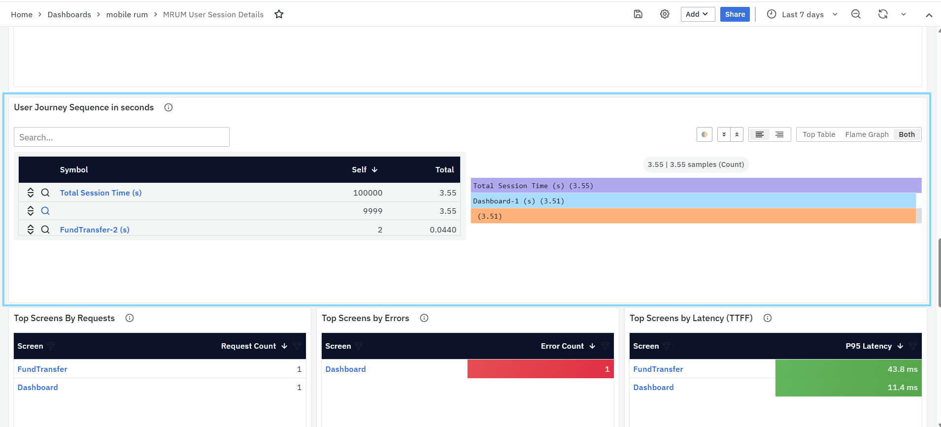 - User Journey Sequence (seconds): A flame graph showing time spent on each screen during the session.