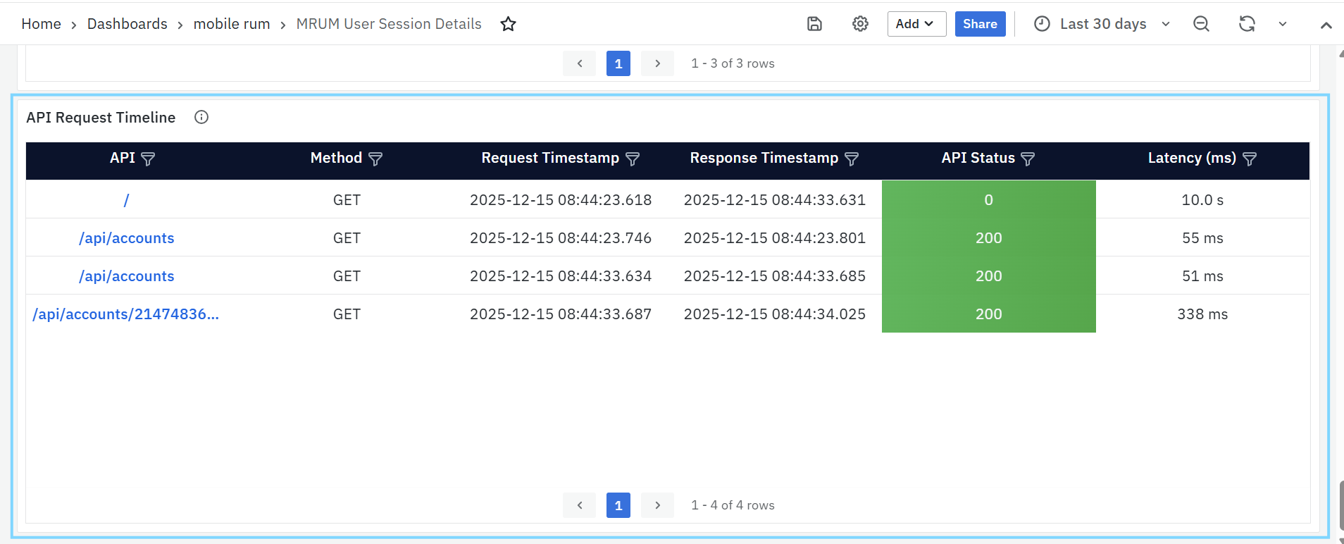 API Request Timeline: Displays a detailed timeline of individual API requests made during the selected session or time range.