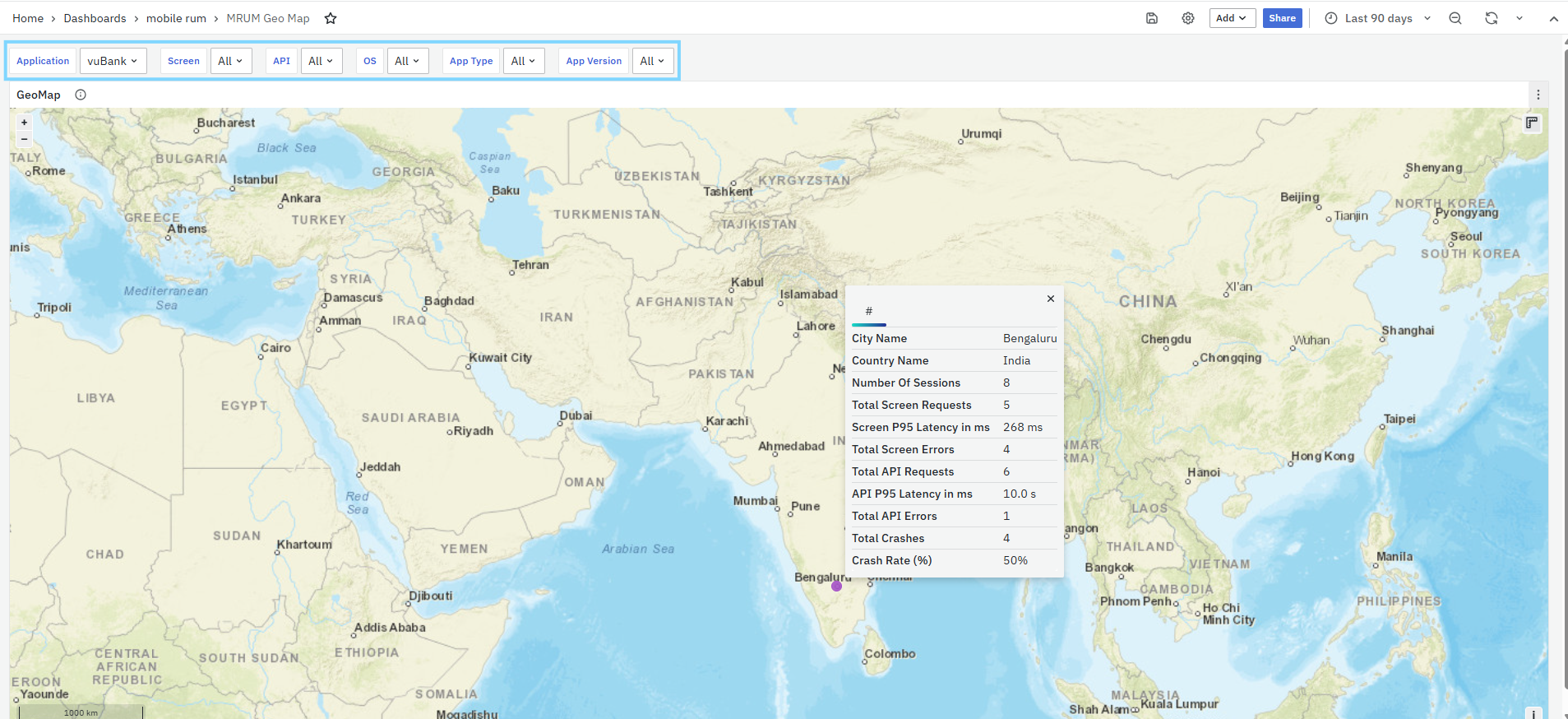 Shows the total count of alerts triggered for the application, covering both screen performance and API-related issues. A higher value may indicate performance degradation or recurring problems requiring attention. - Geo Map