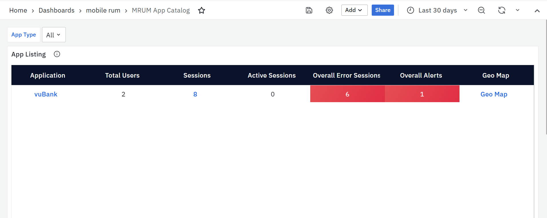 The MRUM App Catalog shows all your monitored mobile applications in one place. It helps you quickly check the status and performance of each app.