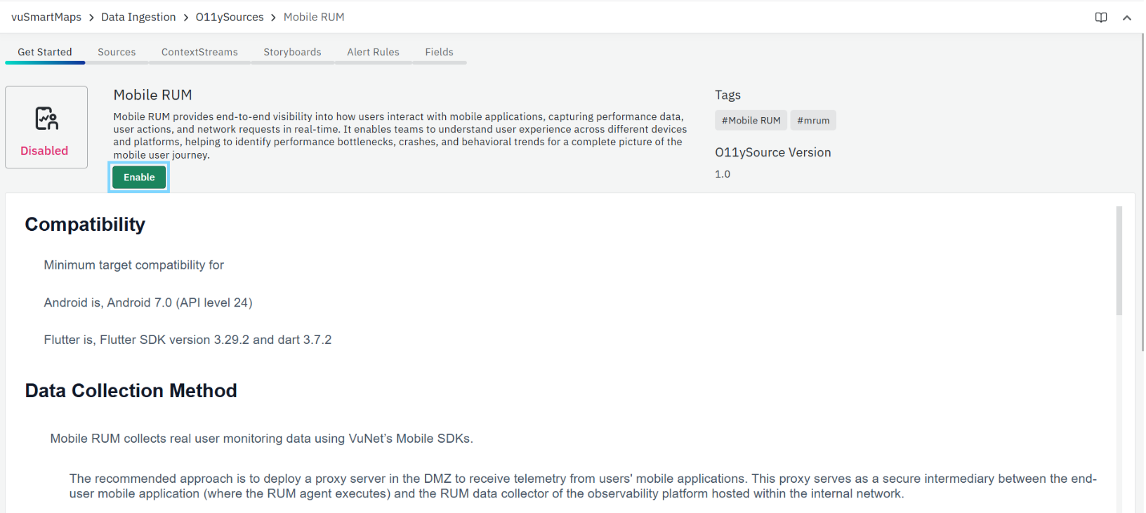 - Click the Enable button to activate Mobile RUM O11ySource.