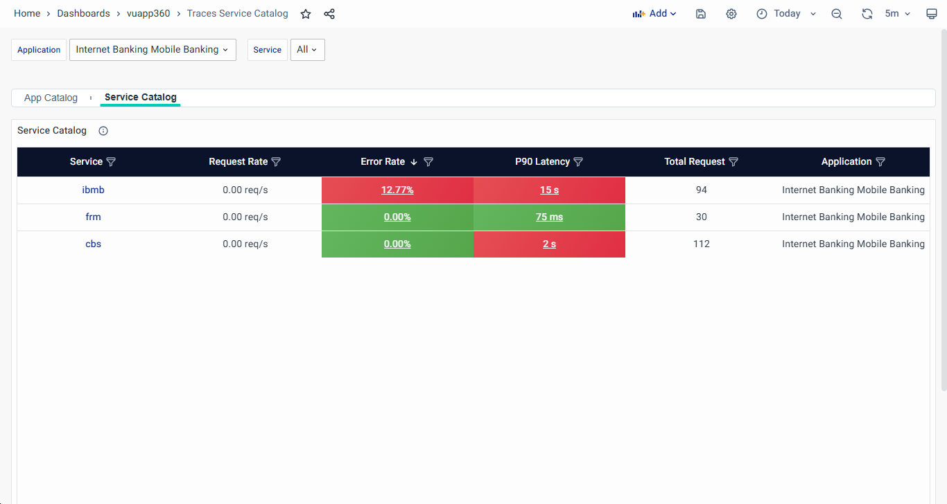 The Application overview dashboards in vuApp360 empower IT Ops, Application Owners, and Business Heads to gain comprehensive insights into their application landscape. It allows to view all the applications in the environment, understand their criticality, and observe their performance metrics in real time. With the Service Catalog and App Catalog options, you can quickly identify problematic applications/ services, predict performance changes, and efficiently troubleshoot issues. This section will guide you through the functionalities and benefits of the Service Catalog and App Catalog.