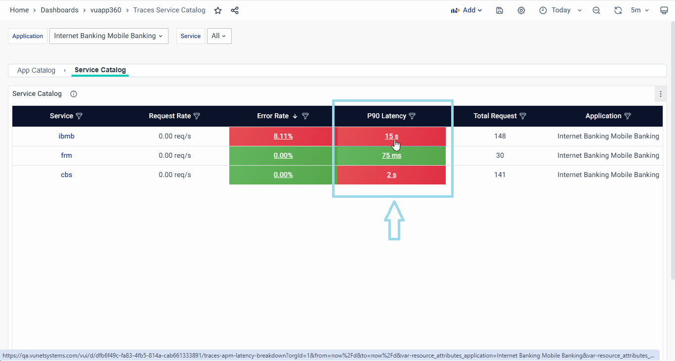 - Navigating to Latency Breakdown Page: Effortlessly access the Latency Breakdown Page by selecting the latency metric associated with your desired application from the Application Catalog page. With a simple click, you'll be directed to the Latency Breakdown Page, where you can analyze latency patterns for the chosen application. To explore the extensive features of this page, refer to the detailed Latency Breakdown section in this user guide.