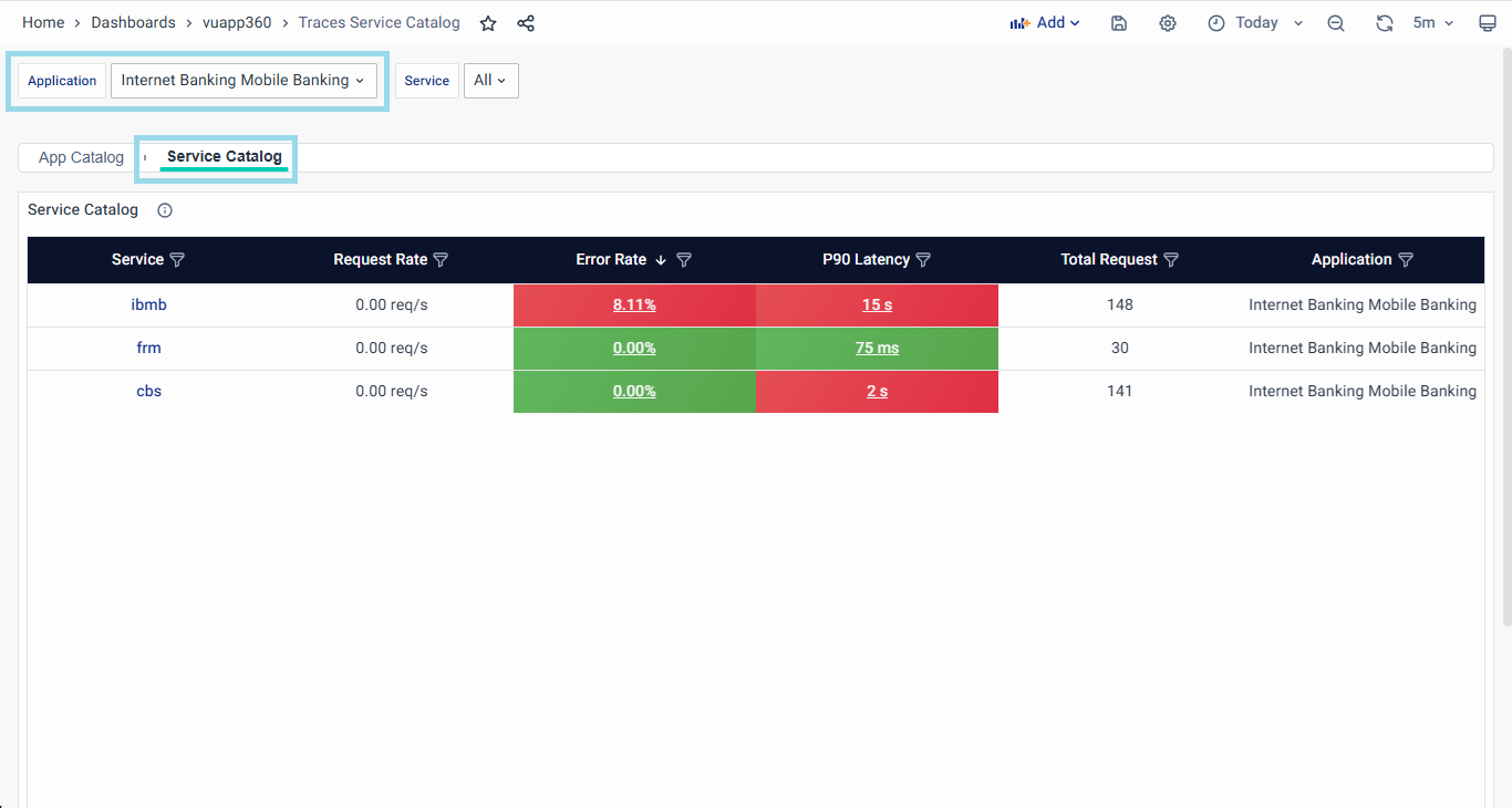 - Filter by Application/Service: Effortlessly filter the Service catalog to focus on a specific application and view the services involved in that particular application. This feature aids in isolating performance issues and understanding the specific application.