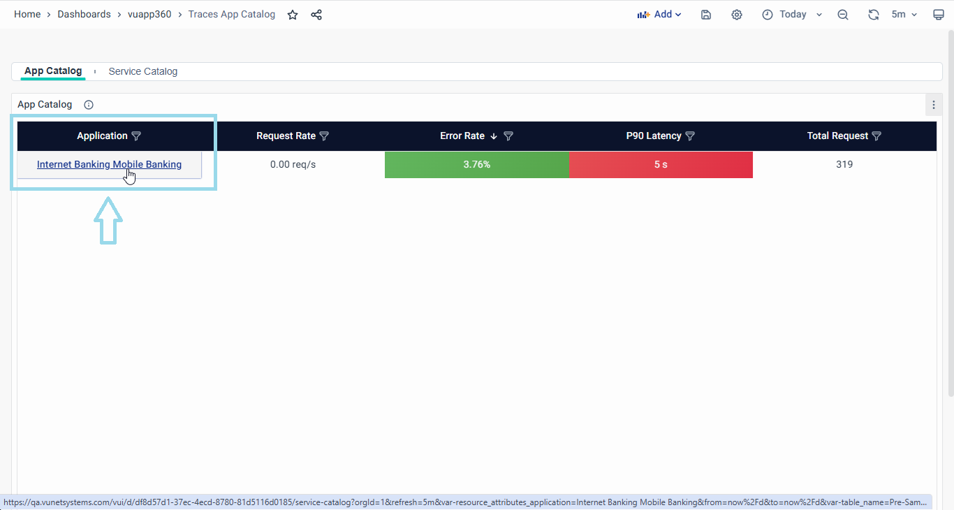 - Navigating to Service Catalog Page: To access the service catalog page, simply click the Application name. This action will seamlessly direct you to the service catalog, automatically applying the filters associated with the chosen application. For an in-depth understanding of this page's functionalities, refer to the comprehensive discussion in the Service Catalog section of this guide.