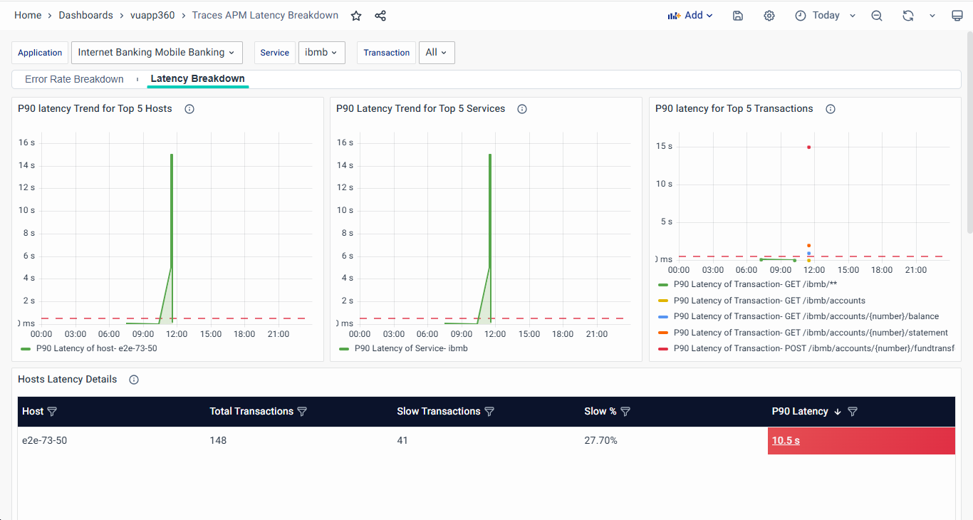 - The visual representation of the latency is provided against Hosts, Services, and API Transactions, enabling users to monitor and assess application health effectively.