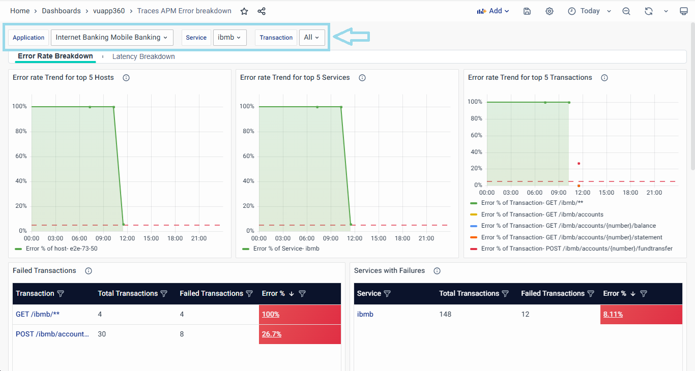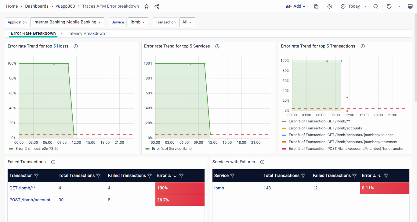 In all the above tables, clicking on the Error % column will navigate users to the Failed Traces Dashboard, allowing for deeper analysis and troubleshooting of failed transactions, services, and hosts.