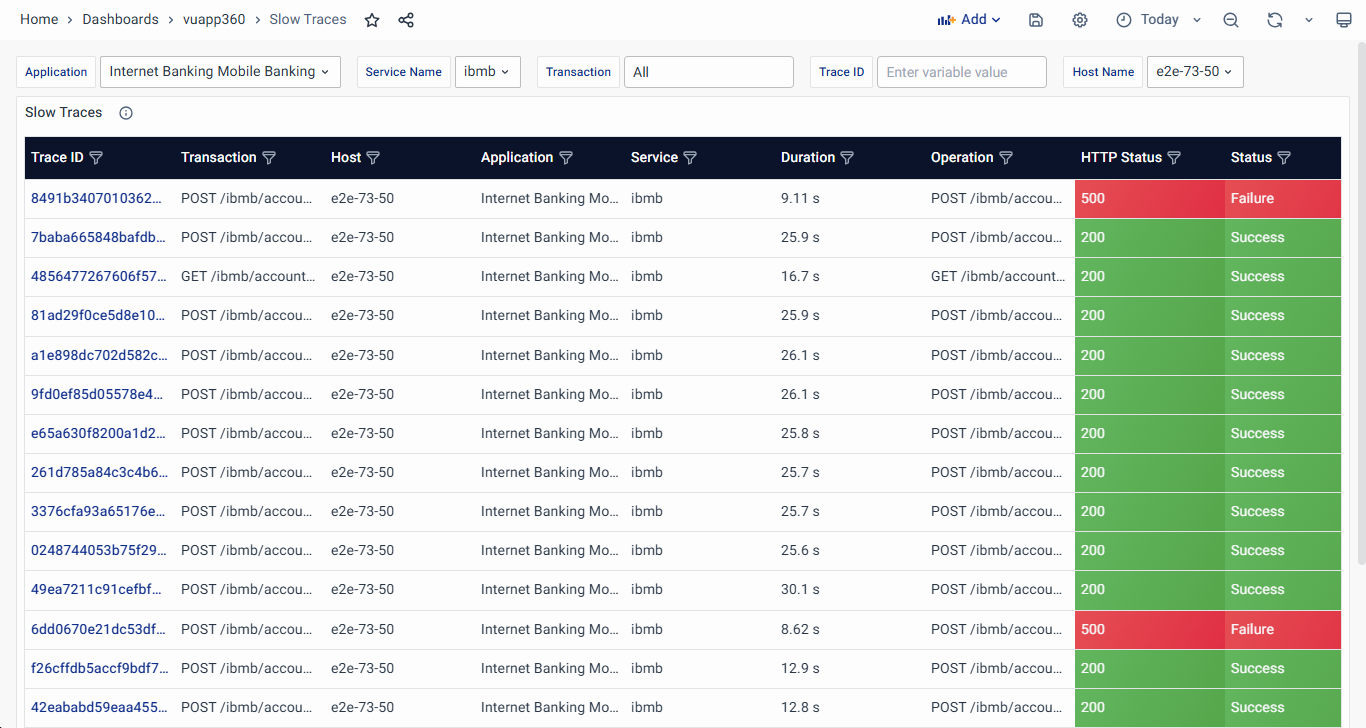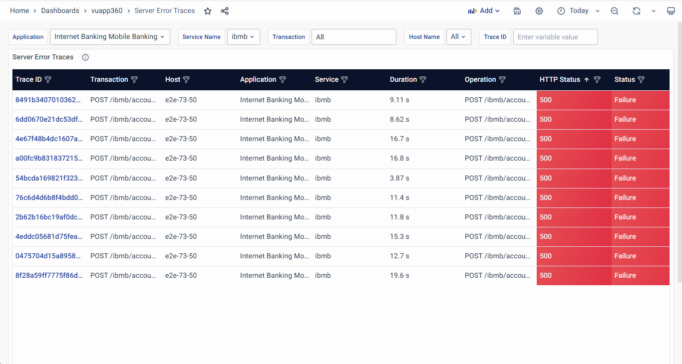 - Server Error Traces: Lists transactions with server-side failures (HTTP 499-600), allowing users to analyze and troubleshoot backend errors.