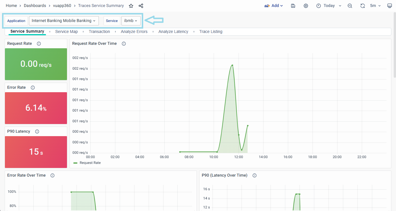 The interactive interface allows users to select the desired Application, Service, or Transaction, tailoring the analysis to specific parameters and enhancing the focus on relevant data points.