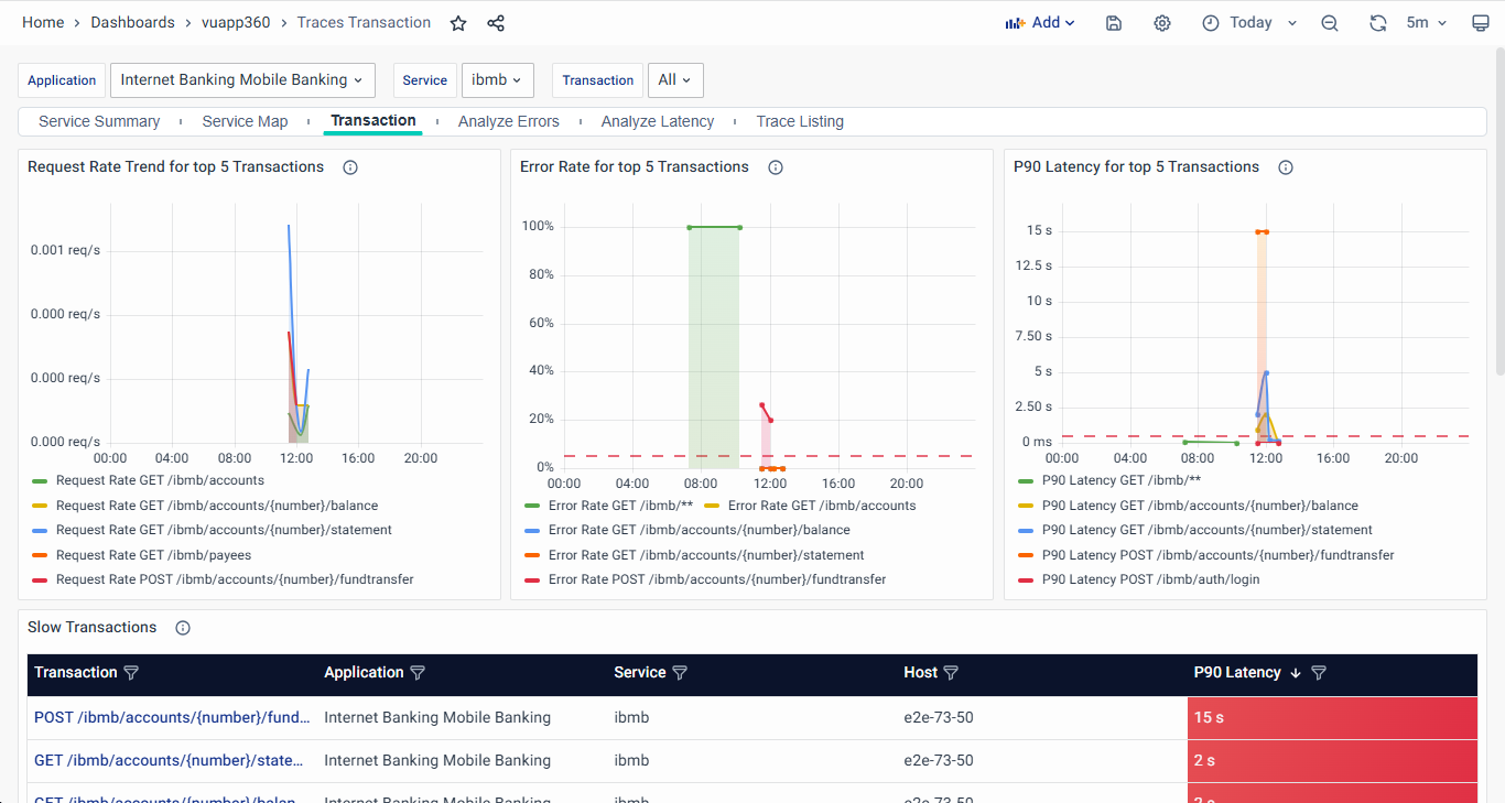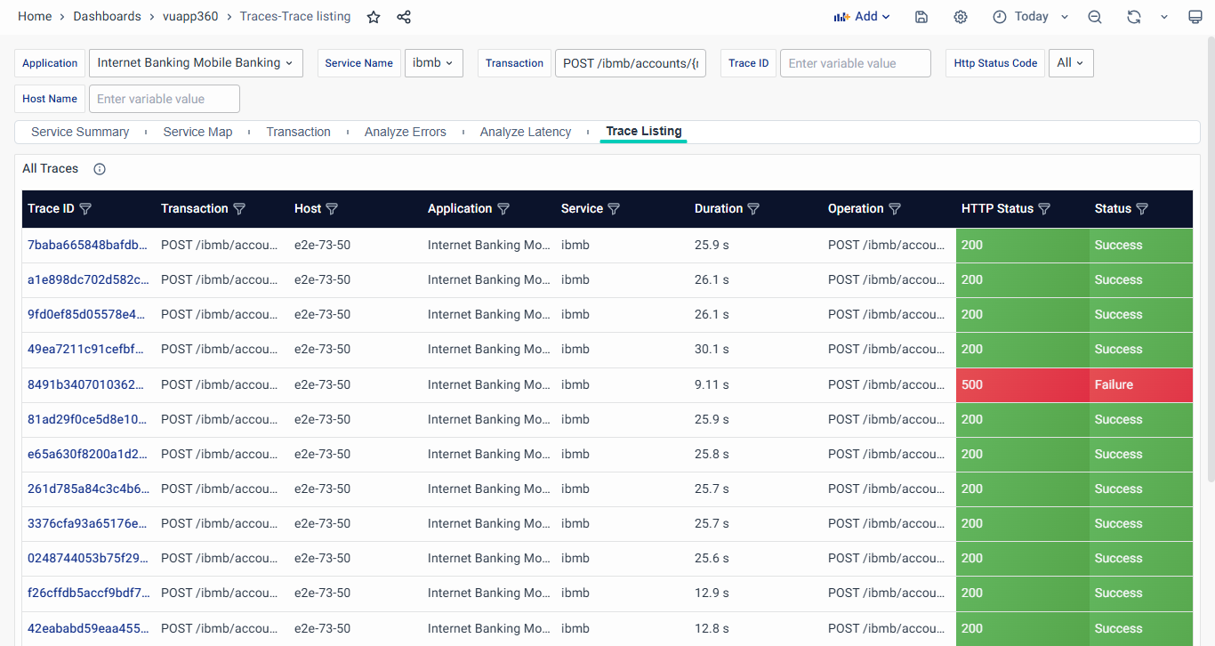 - Clicking on a transaction navigates to the Trace Listing Dashboard, allowing users to drill down into the detailed trace view for deeper investigation.