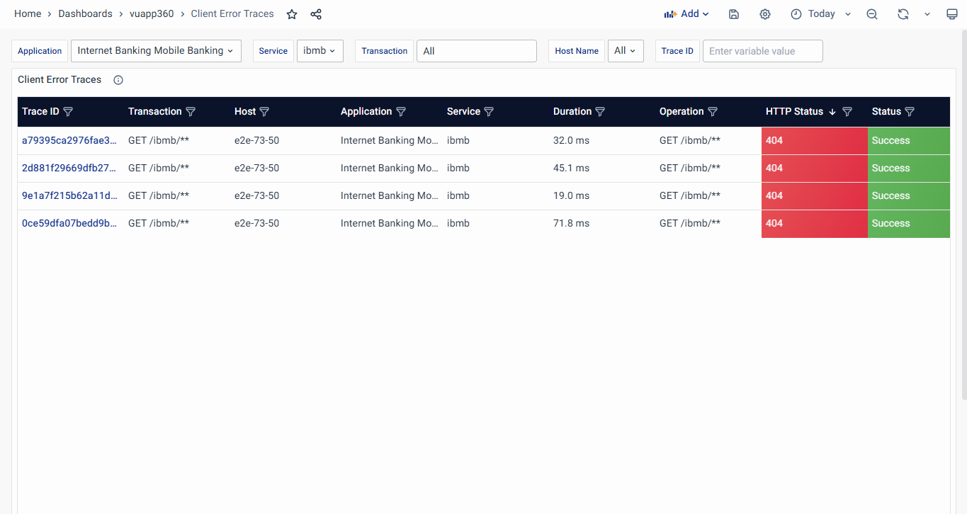 - Client Error Traces: Displays transactions with client-side failures (HTTP 399-500) to help identify and resolve incorrect or unauthorized requests.