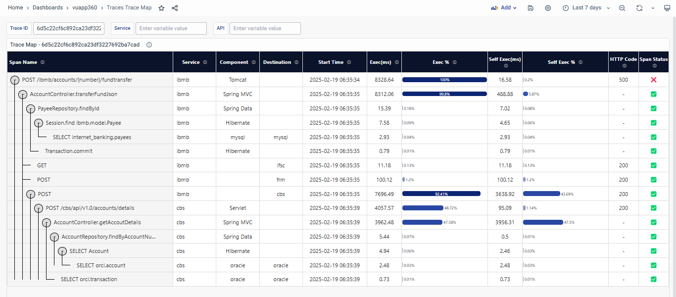 - Clicking on a Trace ID navigates to the Trace Map Dashboard, where users can investigate the request's journey, identify bottlenecks, and analyze dependencies.